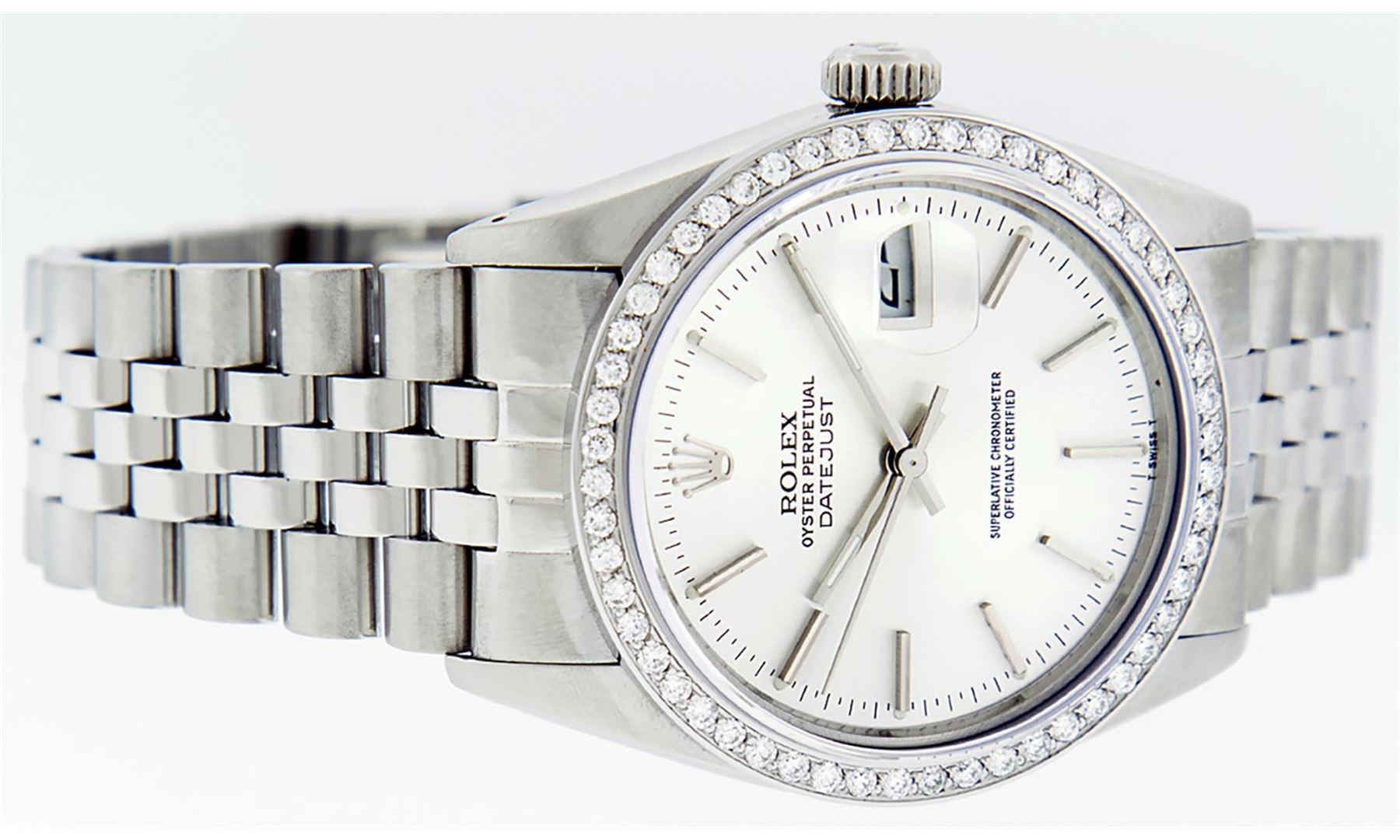 One Men's Rolex Stainless Steel Datejust Polished Bright with Satin Finish, This Watch Has Been Serviced & Electronically Tested, Stainless Steel Case: 36mm, Stainless Steel Crown, Custom Bezel: New Stainless Steel Beadset Diamond Bezel, Diamond Count: 54 Diamonds, Total Weight 1.00 Carat, Clarity: SI-VS, Color: G to H. Custom Crystal: New Synthetic Sapphire Cyclops Lens. Custom Hands: New Luminescent Hands. Movement: Automatic Winding Movement. Custom Dial: Silver Index Dial With Lumi Dots & Dash Track. Date Window: 3 O'clock Position Date Display, Quickset, Model: Datejust. Condition: G-6 Extra Fine. Bracelet: Stainless Steel Jubilee Band. Bright Polish & Satin Finish. 7.0 Inch Length, Adjustable. Standard Clasp, With Rolex Logo. This Watch Has Been Serviced Time Tested And Is In Excellent Condition It Is Free Of All Scratches And Dents.