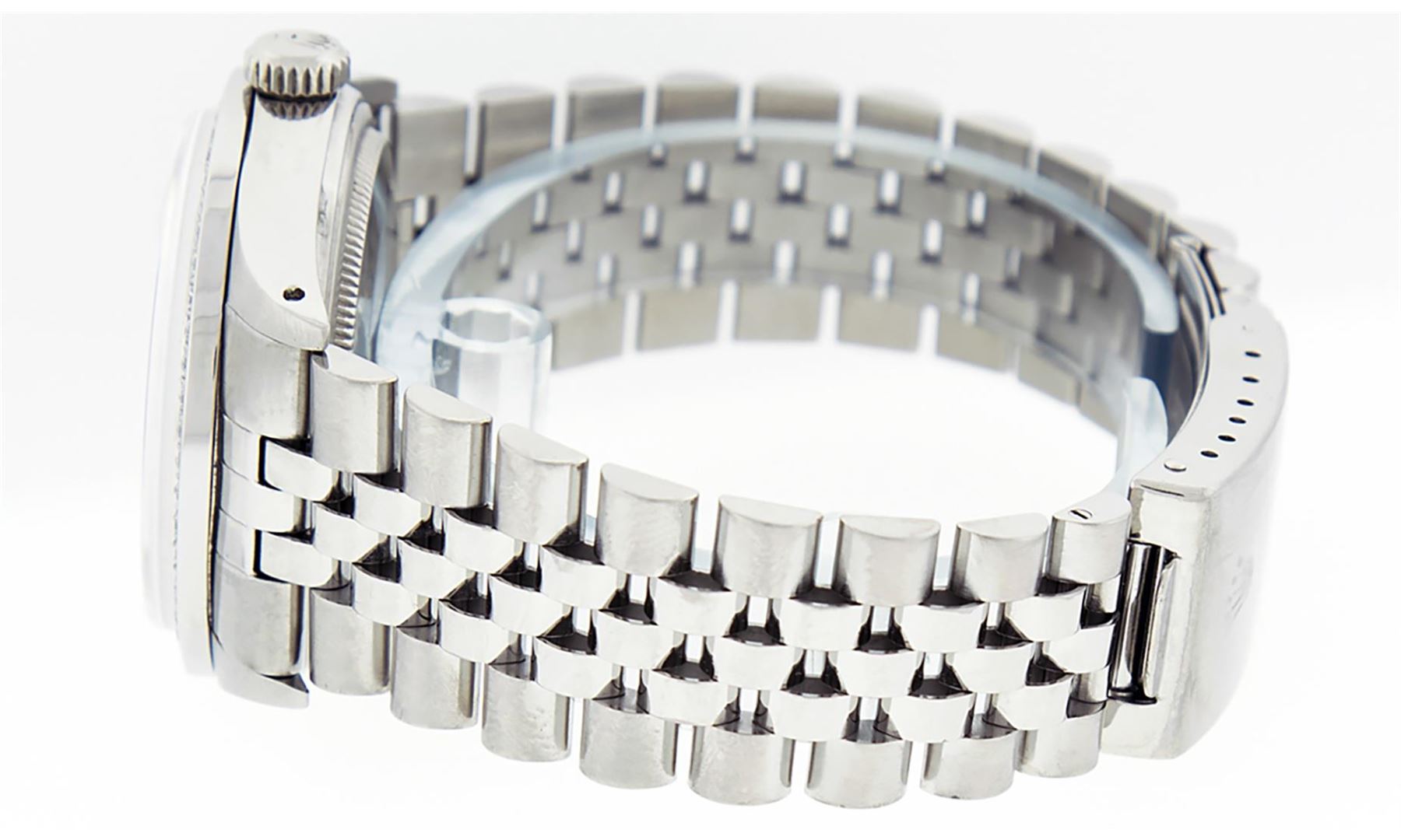 One Men's Rolex Stainless Steel Datejust Polished Bright with Satin Finish, This Watch Has Been Serviced & Electronically Tested, Stainless Steel Case: 36mm, Stainless Steel Crown, Custom Bezel: New Stainless Steel Beadset Diamond Bezel, Diamond Count: 54 Diamonds, Total Weight 1.00 Carat, Clarity: SI-VS, Color: G to H. Custom Crystal: New Synthetic Sapphire Cyclops Lens. Custom Hands: New Luminescent Hands. Movement: Automatic Winding Movement. Custom Dial: Silver Index Dial With Lumi Dots & Dash Track. Date Window: 3 O'Clock Position Date Display, Quickset, Model: Datejust. Condition: G-6 Extra Fine. Bracelet: Stainless Steel Jubilee Band. Bright Polish & Satin Finish. 7.0 Inch Length, Adjustable. Standard Clasp, With Rolex Logo. This Watch Has Been Serviced Time Tested And Is In Excellent Condition It Is Free Of All Scratches And Dents.