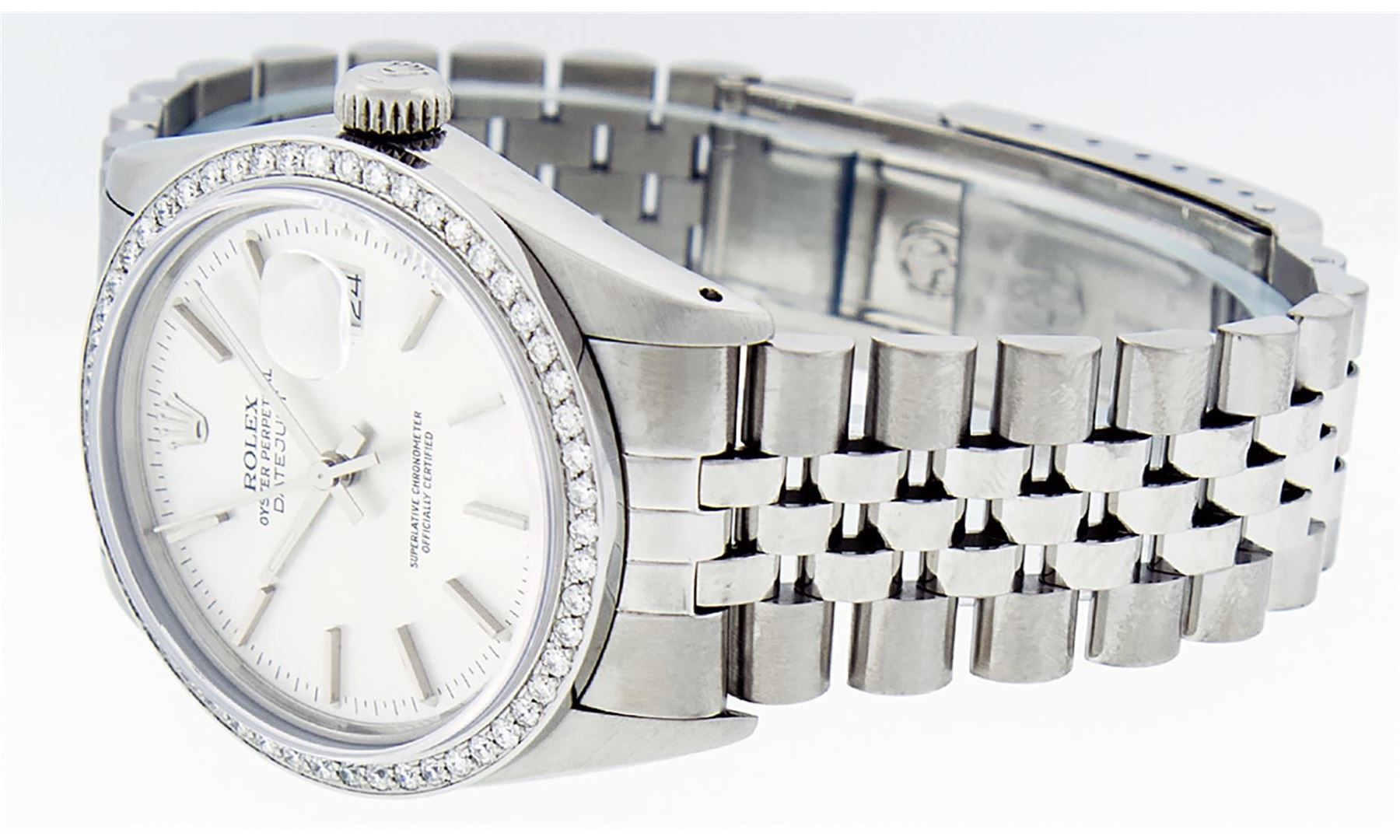 One Men's Rolex Stainless Steel Datejust Polished Bright with Satin Finish, This Watch Has Been Serviced & Electronically Tested, Stainless Steel Case: 36mm, Stainless Steel Crown, Custom Bezel: New Stainless Steel Beadset Diamond Bezel, Diamond Count: 54 Diamonds, Total Weight 1.00 Carat, Clarity: SI-VS, Color: G to H. Custom Crystal: New Synthetic Sapphire Cyclops Lens. Custom Hands: New Luminescent Hands. Movement: Automatic Winding Movement. Custom Dial: Silver Index Dial With Lumi Dots & Dash Track. Date Window: 3 O'Clock Position Date Display, Quickset, Model: Datejust. Condition: G-6 Extra Fine. Bracelet: Stainless Steel Jubilee Band. Bright Polish & Satin Finish. 7.0 Inch Length, Adjustable. Standard Clasp, With Rolex Logo. This Watch Has Been Serviced Time Tested And Is In Excellent Condition It Is Free Of All Scratches And Dents.