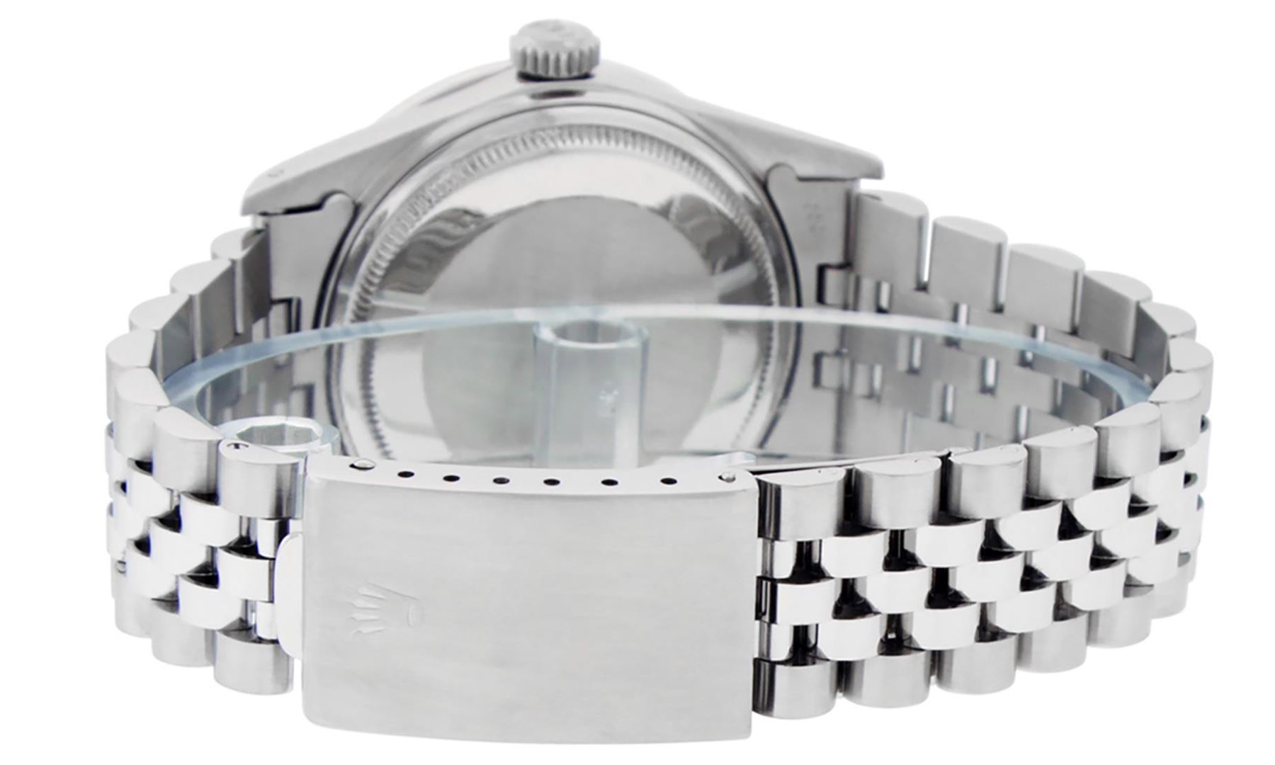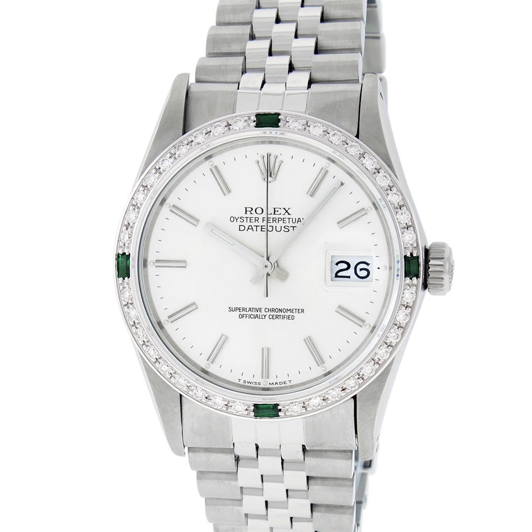 One Men's Stainless Steel Rolex Datejust Polished Bright with Satin Finish, This Watch Has Been Serviced & Electronically Tested, Stainless Steel Case: 36mm, Stainless Steel Crown, Custom Bezel: New 18K White Gold Emerald Beadset Diamond Bezel, Diamond + Gem Count: 36 Diamonds + 4 Emeralds, Total Weight 1.00 Carat, Clarity: SI-VS, Color: G to H. Custom Crystal: New Synthetic Sapphire Cyclops Lens. Custom Hands: New Luminescent Hands. Movement: Automatic Winding Movement Caliber 3035. Dial: Silver Index With Dash Track & Lumi Dots. Date Window: 3 O'clock Position Date Display, Quickset, Model: Datejust, Condition: G-6 Extra Fine. Bracelet: Stainless Steel Jubilee. Bracelet: 7.0 Inch Length, Adjustable. Standard Clasp, With Rolex Logo. This Watch Has Been Serviced Time Tested And Is In Excellent Condition It Is Free Of All Scratches And Dents.