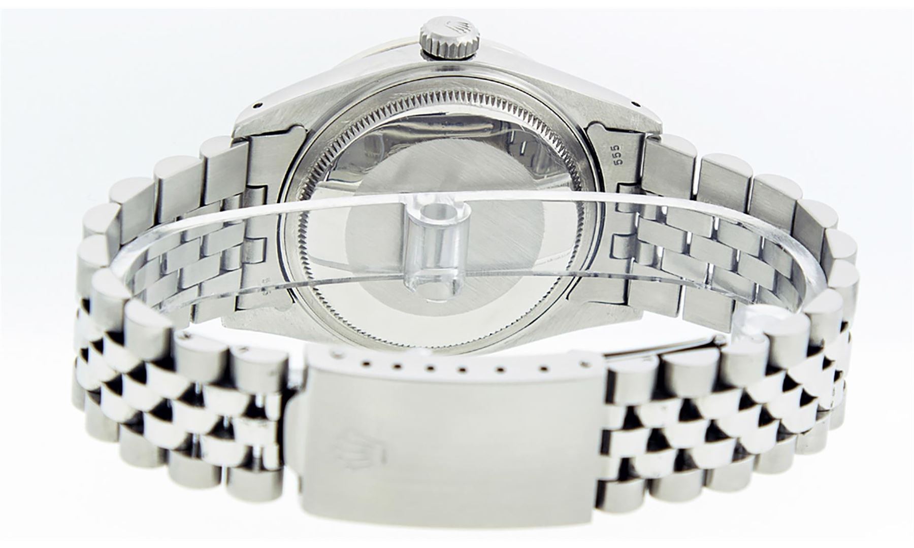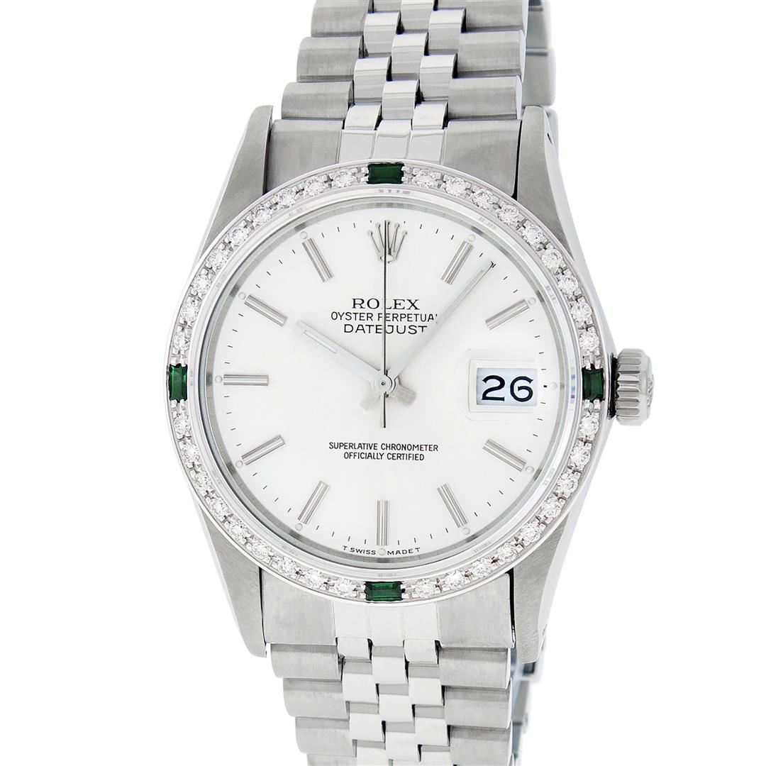 One Men's Stainless Steel Rolex Datejust Polished Bright with Satin Finish, This Watch Has Been Serviced & Electronically Tested, Stainless Steel Case: 36mm, Stainless Steel Crown, Custom Bezel: New 18K White Gold Synthetic Emerald Beadset Diamond Bezel, Diamond + Gem Count: 36 Diamonds + 4 Synthetic Emeralds, Total Weight 1.00 Carat, Clarity: SI-VS, Color: G to H. Custom Crystal: New Synthetic Sapphire Cyclops Lens. Custom Hands: New Luminescent Hands. Movement: Automatic Winding Movement.. Dial: Silver Index With Dash Track & Lumi Dots. Date Window: 3 O'clock Position Date Display, Quickset, Model: Datejust, Condition: G-6 Extra Fine. Bracelet: Stainless Steel Jubilee. Bracelet: 7.0 Inch Length, Adjustable. Standard Clasp, With Rolex Logo. This Watch Has Been Serviced Time Tested And Is In Excellent Condition It Is Free Of All Scratches And Dents.