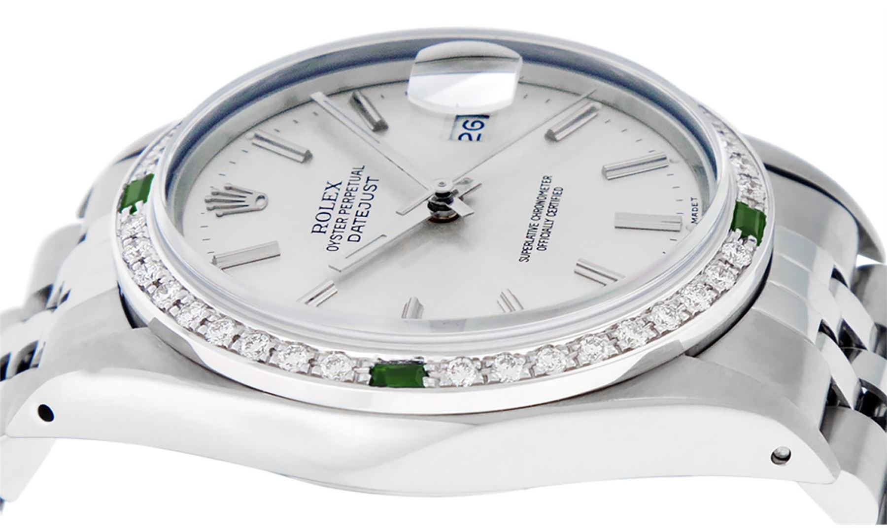 One Men's Stainless Steel Rolex Datejust Polished Bright with Satin Finish, This Watch Has Been Serviced & Electronically Tested, Stainless Steel Case: 36mm, Stainless Steel Crown, Custom Bezel: New 18K White Gold Synthetic Emerald Beadset Diamond Bezel, Diamond + Gem Count: 36 Diamonds + 4 Synthetic Emeralds, Total Weight 1.00 Carat, Clarity: SI-VS, Color: G to H. Custom Crystal: New Synthetic Sapphire Cyclops Lens. Custom Hands: New Luminescent Hands. Movement: Automatic Winding Movement.. Dial: Silver Index With Dash Track & Lumi Dots. Date Window: 3 O'clock Position Date Display, Quickset, Model: Datejust, Condition: G-6 Extra Fine. Bracelet: Stainless Steel Jubilee. Bracelet: 7.0 Inch Length, Adjustable. Standard Clasp, With Rolex Logo. This Watch Has Been Serviced Time Tested And Is In Excellent Condition It Is Free Of All Scratches And Dents.