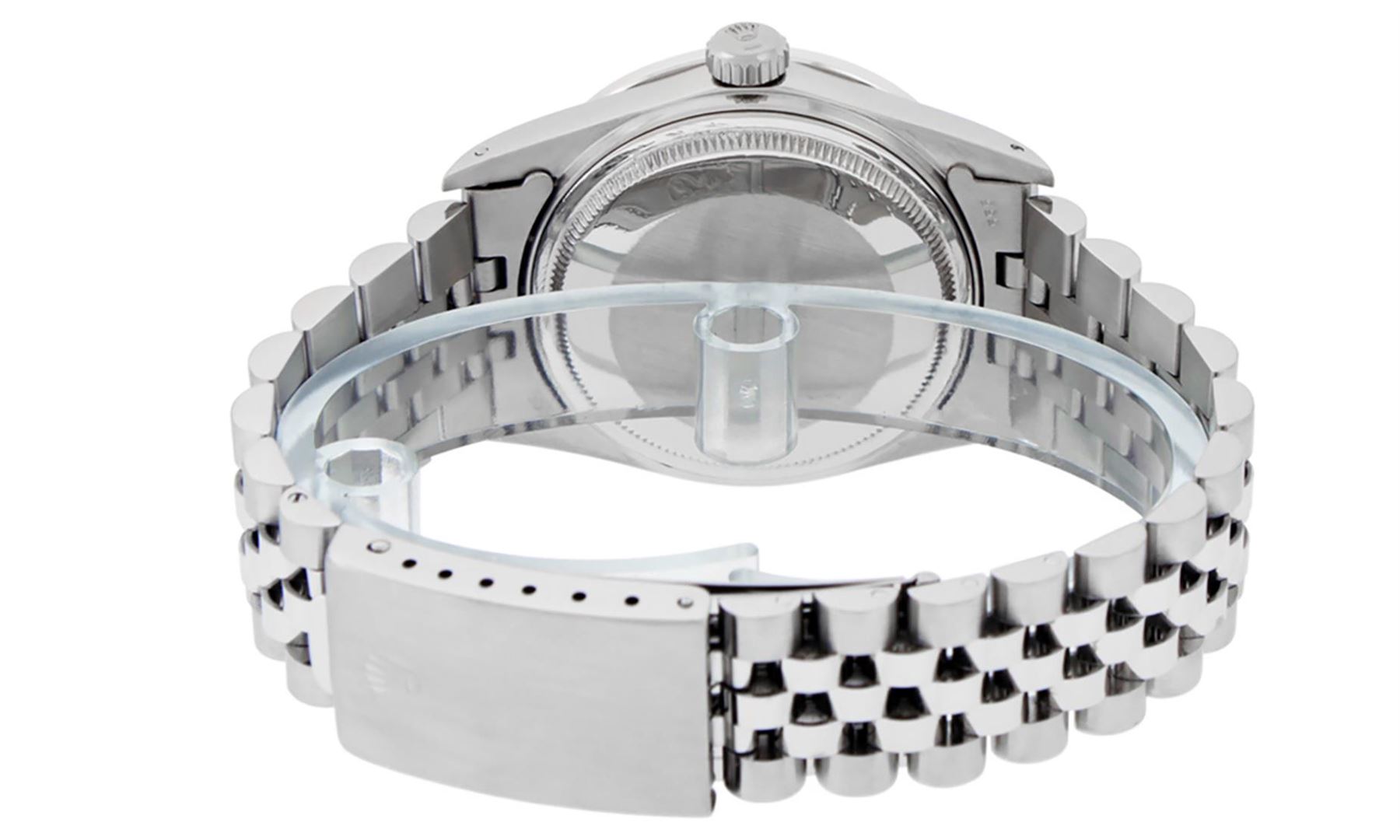 One Men's Stainless Steel Rolex Datejust Polished Bright with Satin Finish, This Watch Has Been Serviced & Electronically Tested, Stainless Steel Case: 36mm, Stainless Steel Crown, Custom Bezel: New 18K White Gold Sapphire Beadset Diamond Bezel, Diamond + Gem Count: 36 Diamonds + 4 Sapphires, Total Weight 1.00 Carat, Clarity: SI-VS, Color: G to H. Custom Crystal: New Synthetic Sapphire Cyclops Lens. Custom Hands: New Luminescent Hands. Movement: Automatic Winding Movement Caliber 3035. Dial: Silver Index With Dash Track & Lumi Dots. Date Window: 3 O'clock Position Date Display, Quickset, Model: Datejust, Condition: G-6 Extra Fine. Bracelet: Stainless Steel Jubilee. Bracelet: 7.0 Inch Length, Adjustable. Standard Clasp, With Rolex Logo. This Watch Has Been Serviced Time Tested And Is In Excellent Condition It Is Free Of All Scratches And Dents.