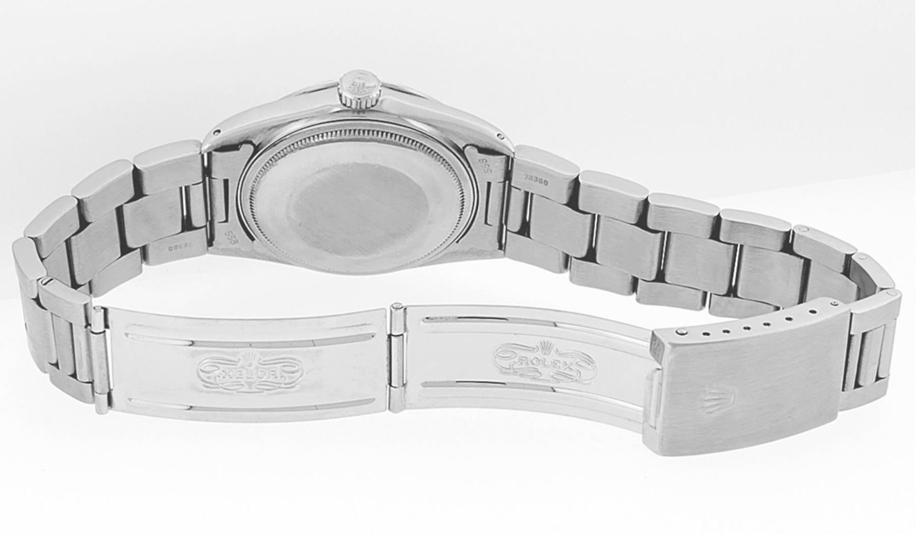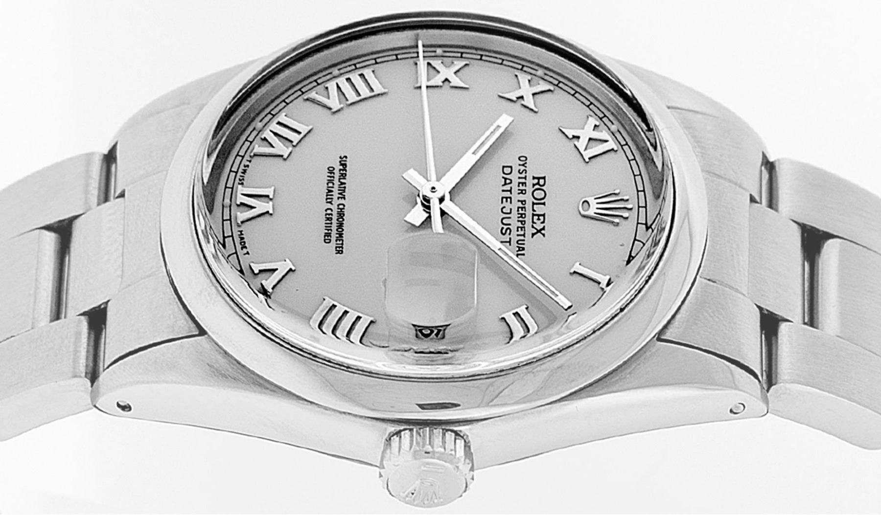 One Men's Rolex Quickset Stainless Steel Datejust Polished Bright with Satin Finish, Serviced & Electronically Tested, Rolex Stainless Steel Case: 36mm, Rolex Stainless Steel Crown, Rolex Bezel: Stainless Steel Smooth Bezel. Crystal: Sapphire With Magnified Date Window. Custom Hands: New Luminescent Hands. Rolex Movement: Automatic Winding Movement Caliber 3135. Custom Dial: Silver Roman With Square Track and Lumi Dot. Date Window: 3 O'Clock Position Date Display, Quickset, Model: Quickset Datejust. Condition: G-6 Extra Fine. Rolex Bracelet: Stainless Steel Oyster Band. Bright Polish & Satin Finish. 7.0 Inch Length, Adjustable. Standard Clasp, With Rolex Logo. This Pre Owned Watch Has Been Serviced Time Tested And Is In Excellent Condition It Is Free Of All Scratches And Dents.
