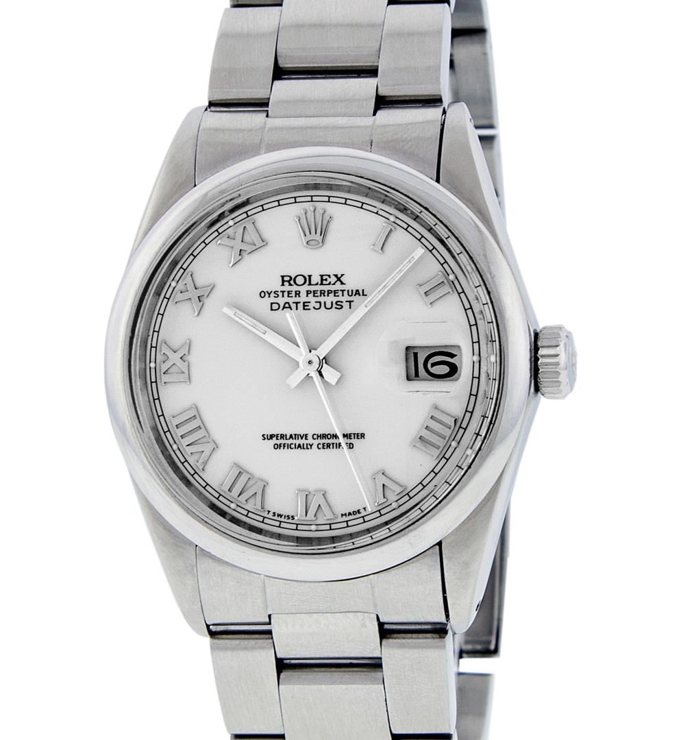 One Men's Rolex Quickset Stainless Steel Datejust Polished Bright with Satin Finish, Serviced & Electronically Tested, Rolex Stainless Steel Case: 36mm, Rolex Stainless Steel Crown, Rolex Bezel: Stainless Steel Smooth Bezel. Crystal: Sapphire With Magnified Date Window. Custom Hands: New Luminescent Hands. Rolex Movement: Automatic Winding Movement Caliber 3135. Custom Dial: Silver Roman With Square Track and Lumi Dot. Date Window: 3 O'Clock Position Date Display, Quickset, Model: Quickset Datejust. Condition: G-6 Extra Fine. Rolex Bracelet: Stainless Steel Oyster Band. Bright Polish & Satin Finish. 7.0 Inch Length, Adjustable. Standard Clasp, With Rolex Logo. This Pre Owned Watch Has Been Serviced Time Tested And Is In Excellent Condition It Is Free Of All Scratches And Dents.