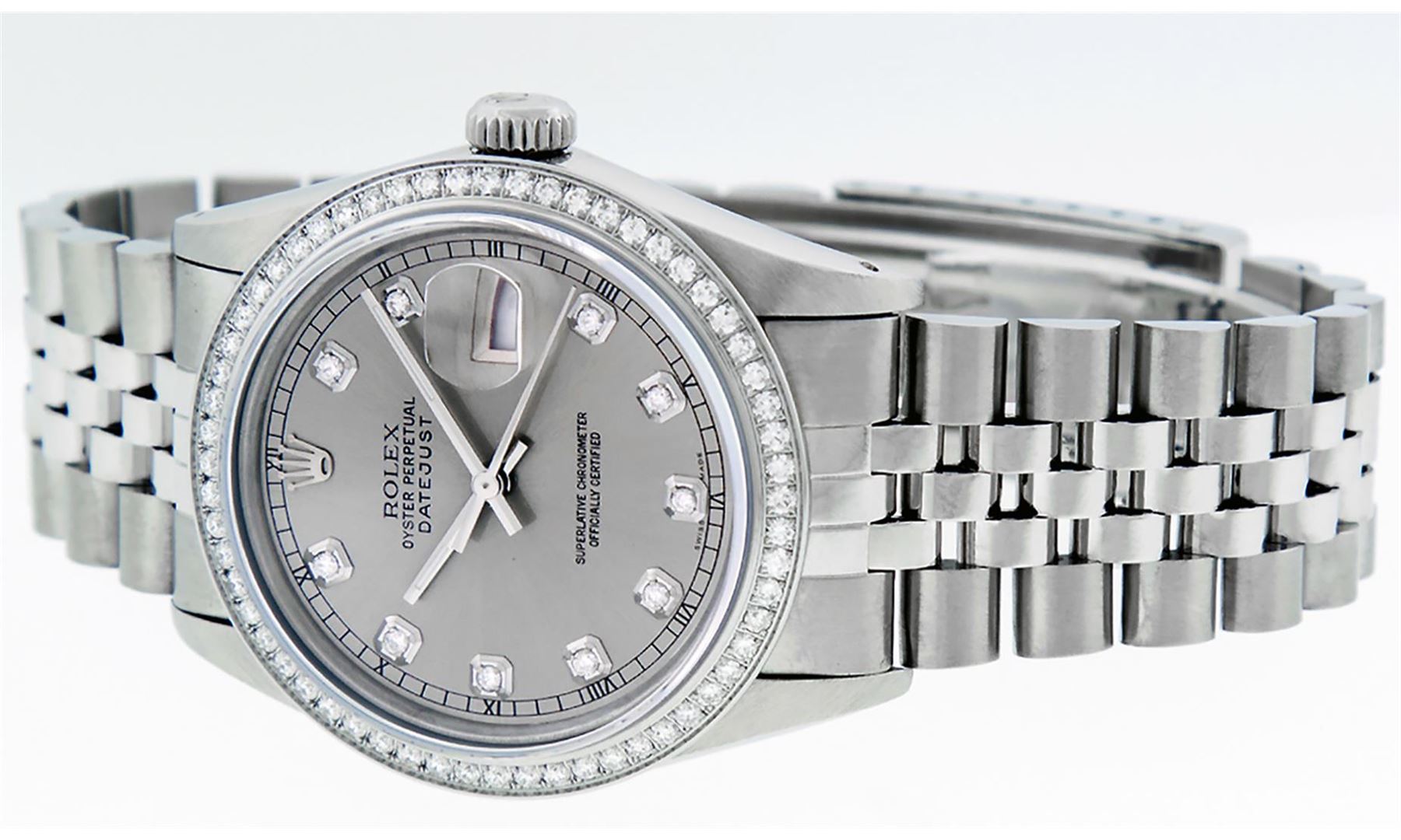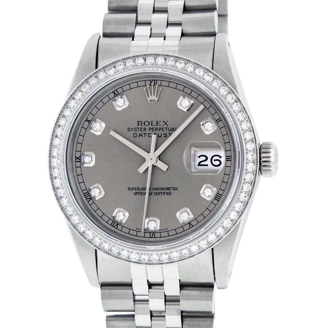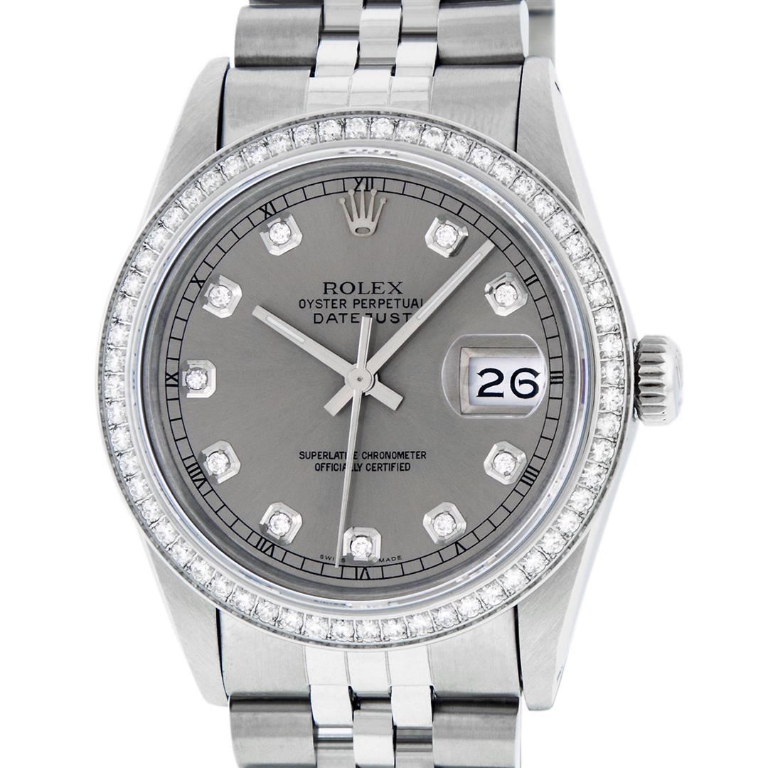One Men's Rolex Stainless Steel Datejust Polished Bright with Satin Finish, This Watch Has Been Serviced & Electronically Tested, Stainless Steel Case: 36mm, Stainless Steel Crown, Custom Bezel: New Stainless Steel Beadset Diamond Bezel, Diamond Count: 54 Diamonds, Total Weight 1.00 Carat, Clarity: SI-VS, Color: G to H. Custom Crystal: New Synthetic Sapphire Cyclops Lens. Custom Hands: New Luminescent Hands. Movement: Automatic Winding Movement.. Custom Dial: Slate Grey Diamond Dial, Diamond Count: 10 Diamonds In Dial, Color: G to H, Clarity: VS2-SI1. Date Window: 3 O'clock Position Date Display, Quickset, Model: Datejust. Condition: G-6 Extra Fine. Bracelet: Stainless Steel Jubilee Band. Bright Polish & Satin Finish. 7.0 Inch Length, Adjustable. Standard Clasp, With Rolex Logo. This Watch Has Been Serviced Time Tested And Is In Excellent Condition It Is Free Of All Scratches And Dents.