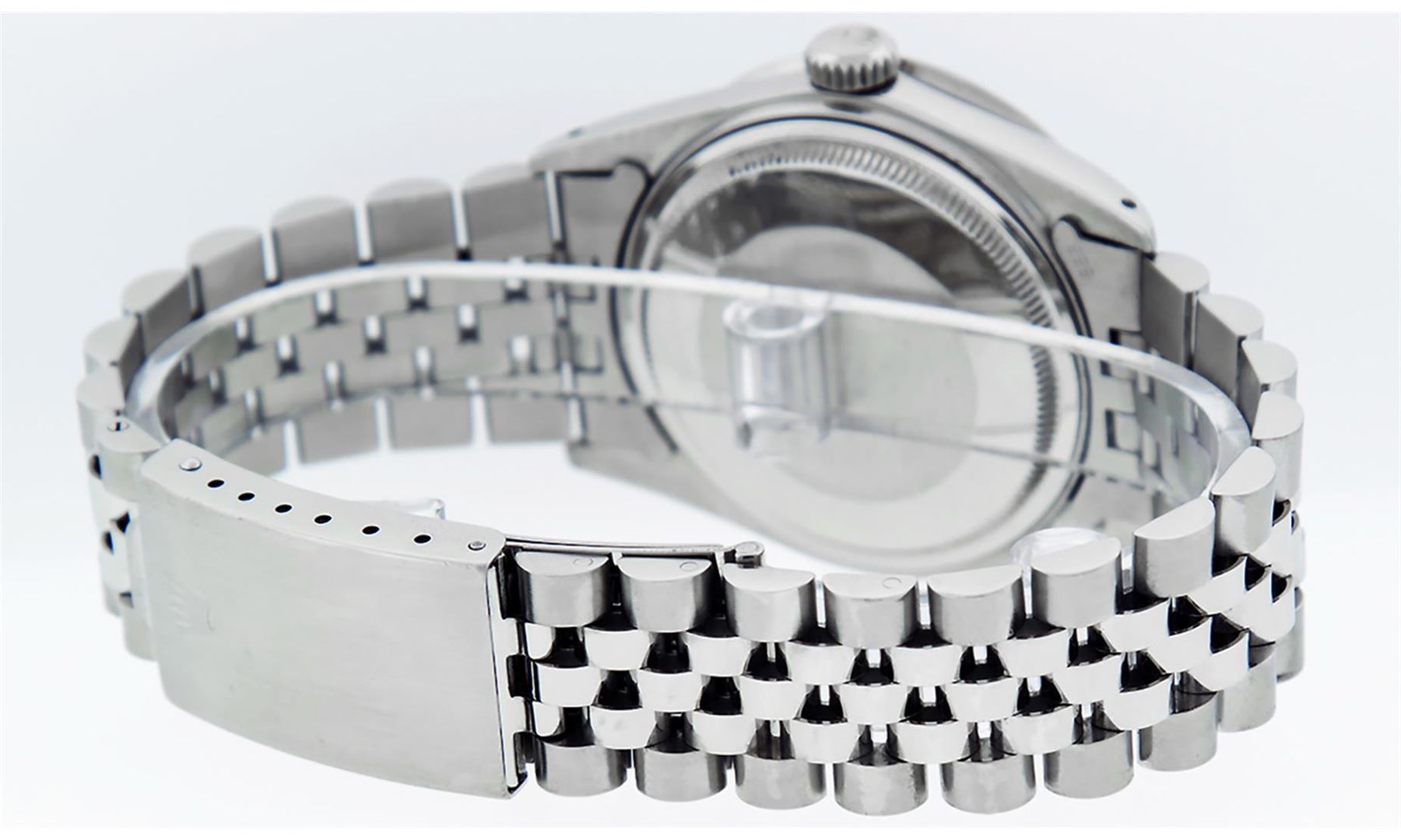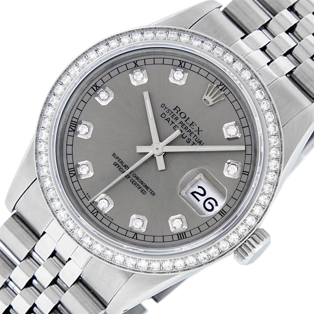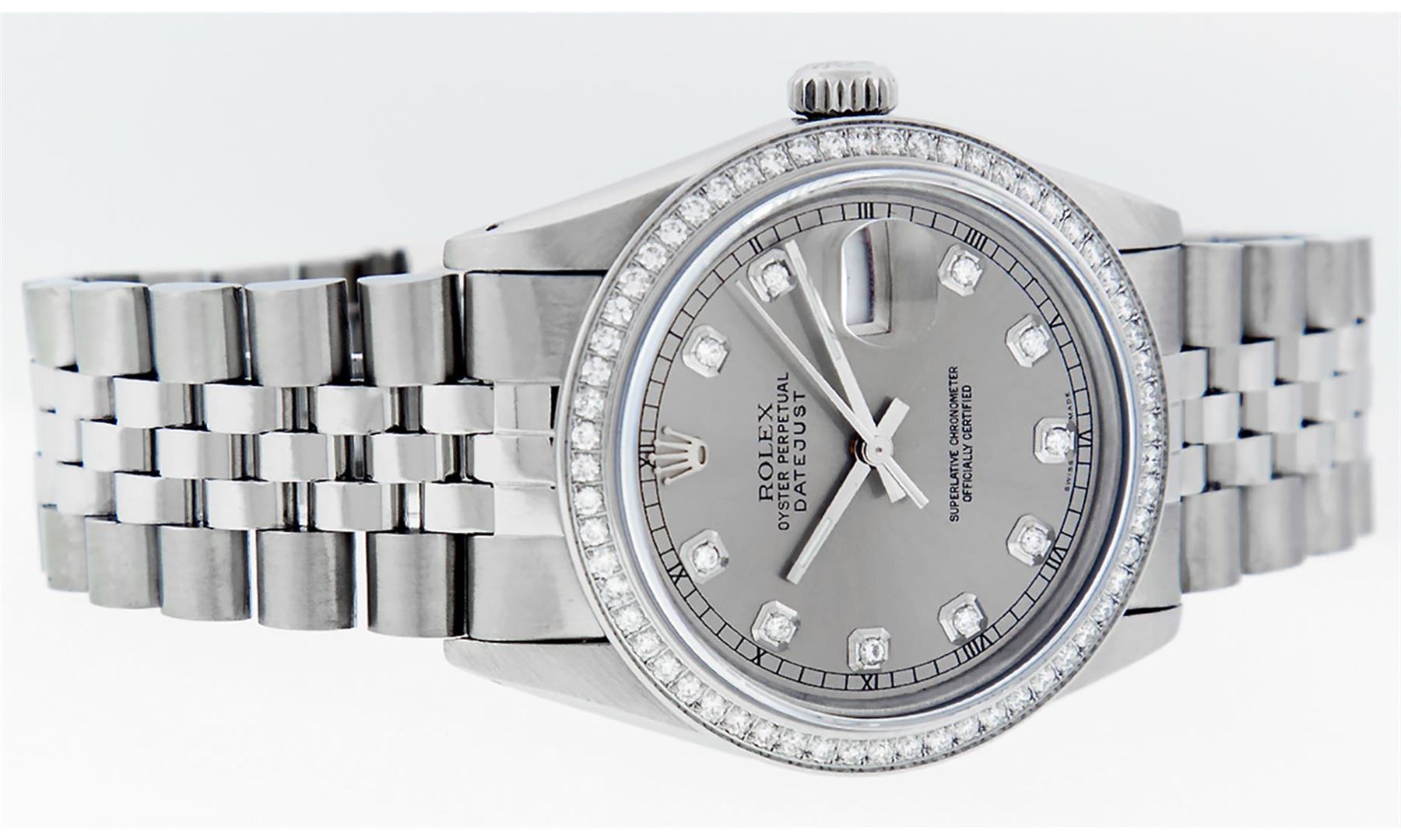 One Men's Rolex Stainless Steel Datejust Polished Bright with Satin Finish, This Watch Has Been Serviced & Electronically Tested, Stainless Steel Case: 36mm, Stainless Steel Crown, Custom Bezel: New Stainless Steel Beadset Diamond Bezel, Diamond Count: 54 Diamonds, Total Weight 1.00 Carat, Clarity: SI-VS, Color: G to H. Custom Crystal: New Synthetic Sapphire Cyclops Lens. Custom Hands: New Luminescent Hands. Movement: Automatic Winding Movement.. Custom Dial: Slate Grey Diamond Dial, Diamond Count: 10 Diamonds In Dial, Color: G to H, Clarity: VS2-SI1. Date Window: 3 O'clock Position Date Display, Quickset, Model: Datejust. Condition: G-6 Extra Fine. Bracelet: Stainless Steel Jubilee Band. Bright Polish & Satin Finish. 7.0 Inch Length, Adjustable. Standard Clasp, With Rolex Logo. This Watch Has Been Serviced Time Tested And Is In Excellent Condition It Is Free Of All Scratches And Dents.