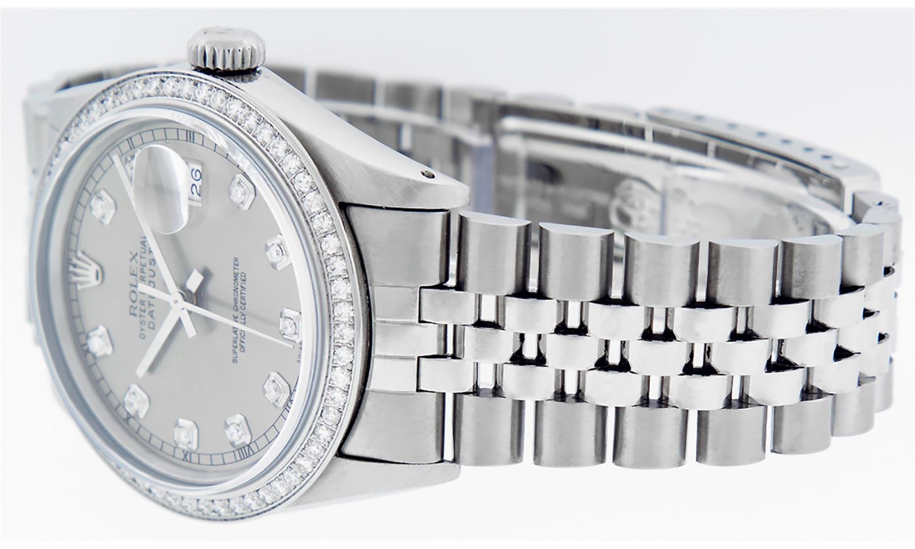 One Men's Rolex Stainless Steel Datejust Polished Bright with Satin Finish, This Watch Has Been Serviced & Electronically Tested, Stainless Steel Case: 36mm, Stainless Steel Crown, Custom Bezel: New Stainless Steel Beadset Diamond Bezel, Diamond Count: 54 Diamonds, Total Weight 1.00 Carat, Clarity: SI-VS, Color: G to H. Custom Crystal: New Synthetic Sapphire Cyclops Lens. Custom Hands: New Luminescent Hands. Movement: Automatic Winding Movement Caliber 3035. Custom Dial: Slate Grey Diamond Dial, Diamond Count: 10 Diamonds In Dial, Color: G to H, Clarity: VS2-SI1. Date Window: 3 O'clock Position Date Display, Quickset, Model: Datejust. Condition: G-6 Extra Fine. Bracelet: Stainless Steel Jubilee Band. Bright Polish & Satin Finish. 7.0 Inch Length, Adjustable. Standard Clasp, With Rolex Logo. This Watch Has Been Serviced Time Tested And Is In Excellent Condition It Is Free Of All Scratches And Dents.