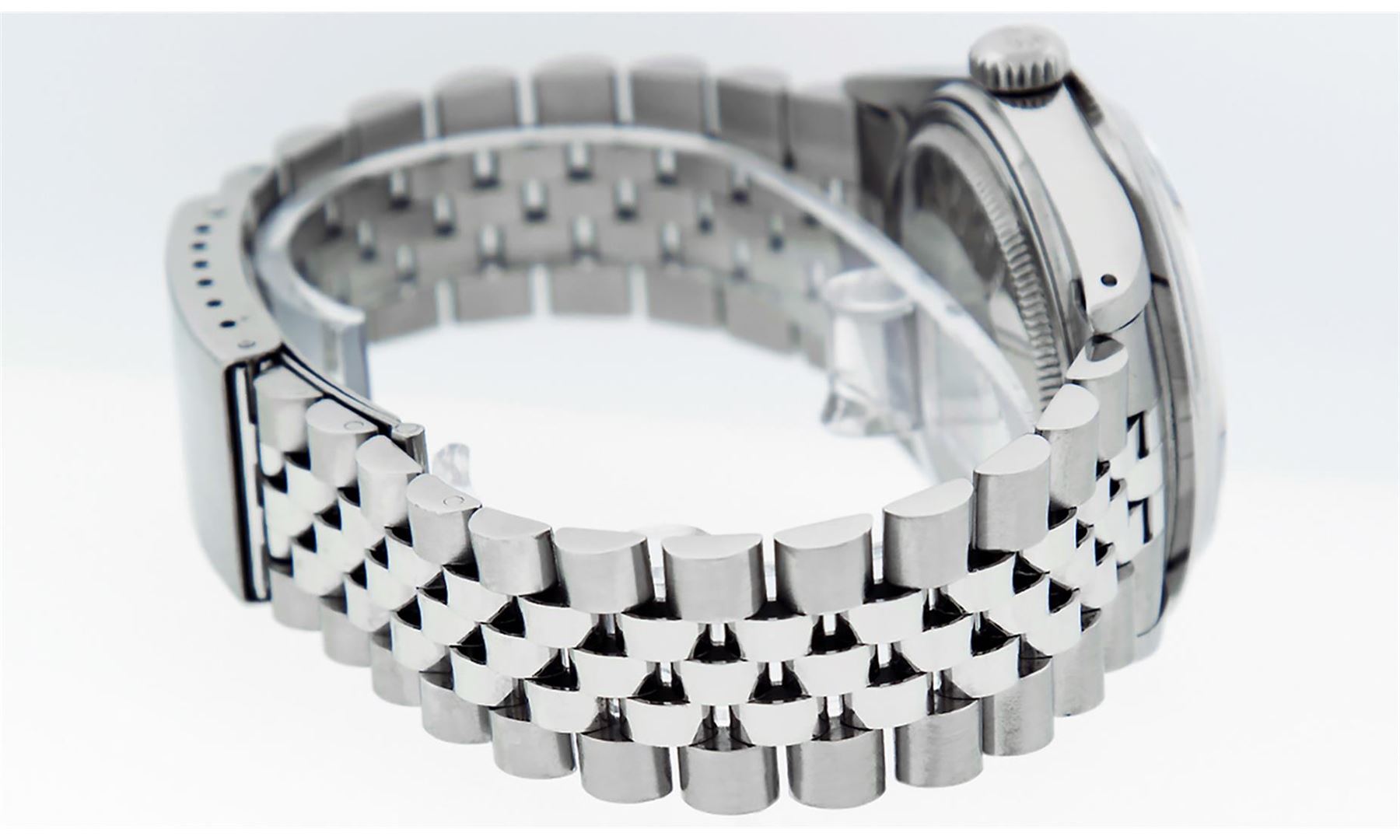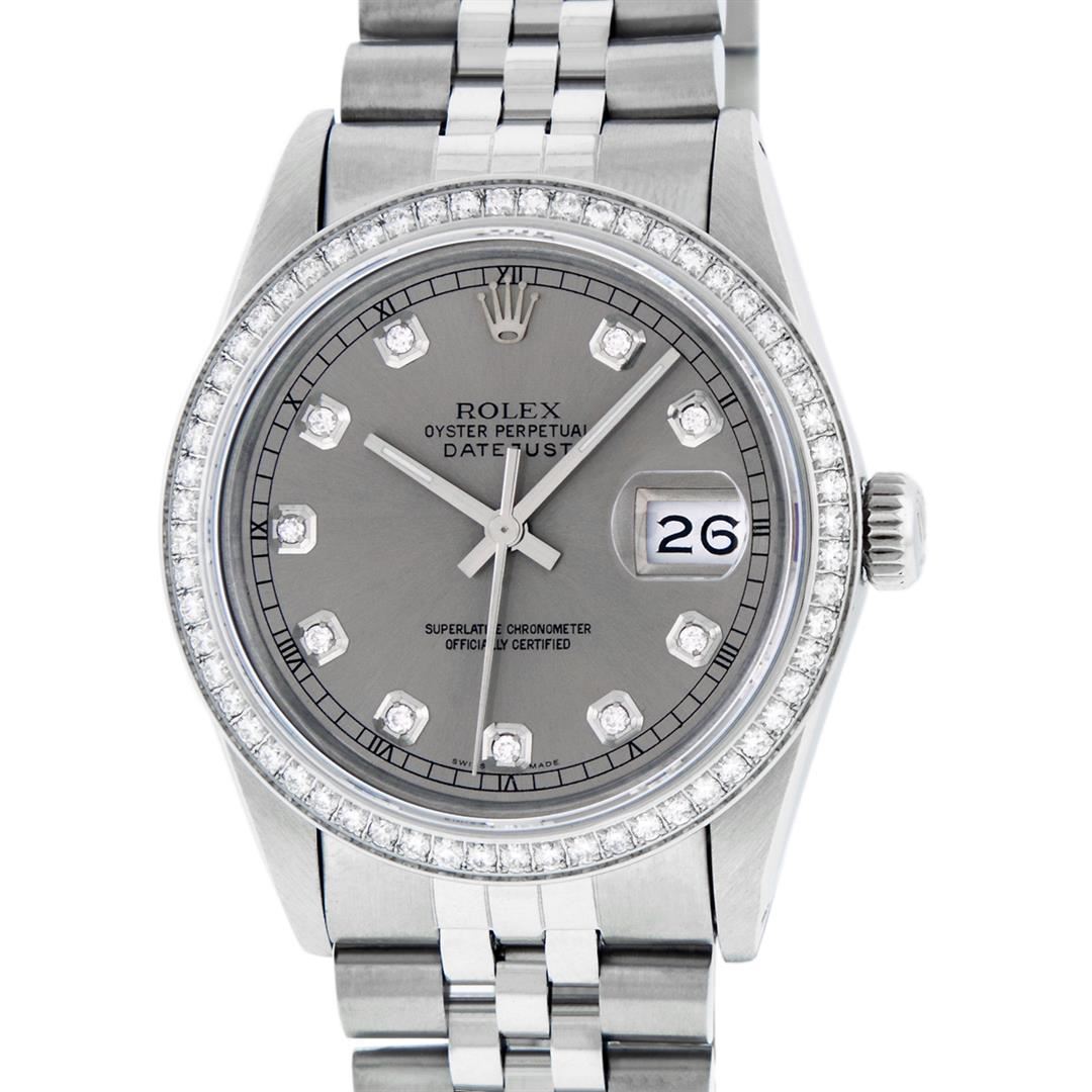 One Men's Rolex Stainless Steel Datejust Polished Bright with Satin Finish, This Watch Has Been Serviced & Electronically Tested, Stainless Steel Case: 36mm, Stainless Steel Crown, Custom Bezel: New Stainless Steel Beadset Diamond Bezel, Diamond Count: 54 Diamonds, Total Weight 1.00 Carat, Clarity: SI-VS, Color: G to H. Custom Crystal: New Synthetic Sapphire Cyclops Lens. Custom Hands: New Luminescent Hands. Movement: Automatic Winding Movement Caliber 3035. Custom Dial: Slate Grey Diamond Dial, Diamond Count: 10 Diamonds In Dial, Color: G to H, Clarity: VS2-SI1. Date Window: 3 O'clock Position Date Display, Quickset, Model: Datejust. Condition: G-6 Extra Fine. Bracelet: Stainless Steel Jubilee Band. Bright Polish & Satin Finish. 7.0 Inch Length, Adjustable. Standard Clasp, With Rolex Logo. This Watch Has Been Serviced Time Tested And Is In Excellent Condition It Is Free Of All Scratches And Dents.