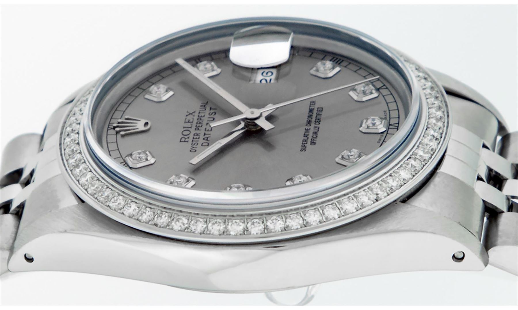 One Men's Rolex Stainless Steel Datejust Polished Bright with Satin Finish, This Watch Has Been Serviced & Electronically Tested, Stainless Steel Case: 36mm, Stainless Steel Crown, Custom Bezel: New Stainless Steel Beadset Diamond Bezel, Diamond Count: 54 Diamonds, Total Weight 1.00 Carat, Clarity: SI-VS, Color: G to H. Custom Crystal: New Synthetic Sapphire Cyclops Lens. Custom Hands: New Luminescent Hands. Movement: Automatic Winding Movement Caliber 3035. Custom Dial: Slate Grey Diamond Dial, Diamond Count: 10 Diamonds In Dial, Color: G to H, Clarity: VS2-SI1. Date Window: 3 O'clock Position Date Display, Quickset, Model: Datejust. Condition: G-6 Extra Fine. Bracelet: Stainless Steel Jubilee Band. Bright Polish & Satin Finish. 7.0 Inch Length, Adjustable. Standard Clasp, With Rolex Logo. This Watch Has Been Serviced Time Tested And Is In Excellent Condition It Is Free Of All Scratches And Dents.