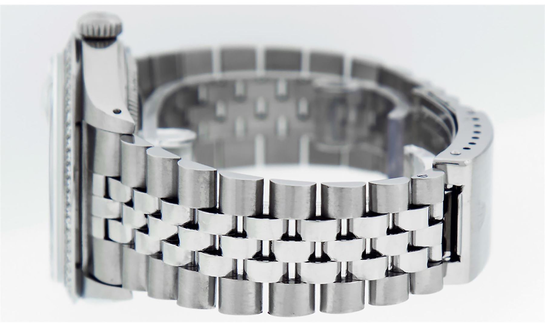 One Men's Rolex Stainless Steel Datejust Polished Bright with Satin Finish, This Watch Has Been Serviced & Electronically Tested, Stainless Steel Case: 36mm, Stainless Steel Crown, Custom Bezel: New Stainless Steel Beadset Diamond Bezel, Diamond Count: 54 Diamonds, Total Weight 1.00 Carat, Clarity: SI-VS, Color: G to H. Custom Crystal: New Synthetic Sapphire Cyclops Lens. Custom Hands: New Luminescent Hands. Movement: Automatic Winding Movement. Custom Dial: Slate Grey Diamond Dial, Diamond Count: 10 Diamonds In Dial, Color: G to H, Clarity: VS2-SI1. Date Window: 3 O'Clock Position Date Display, Quickset, Model: Datejust. Condition: G-6 Extra Fine. Bracelet: Stainless Steel Jubilee Band. Bright Polish & Satin Finish. 7.0 Inch Length, Adjustable. Standard Clasp, With Rolex Logo. This Watch Has Been Serviced Time Tested And Is In Excellent Condition It Is Free Of All Scratches And Dents.