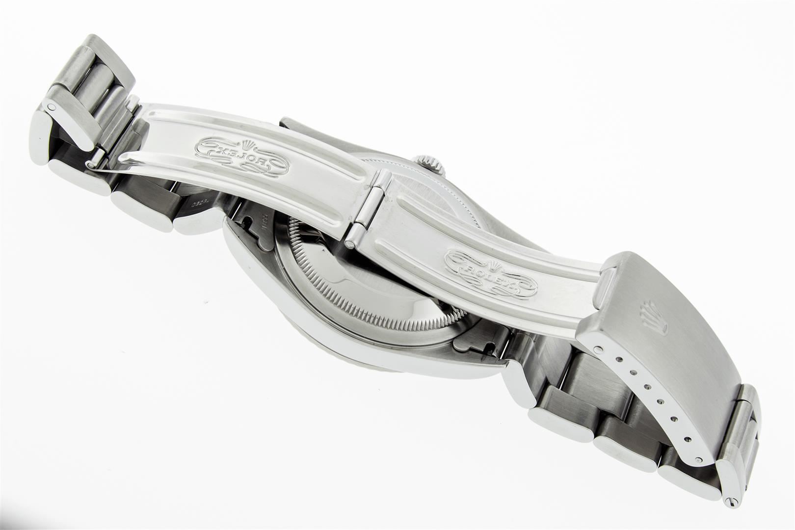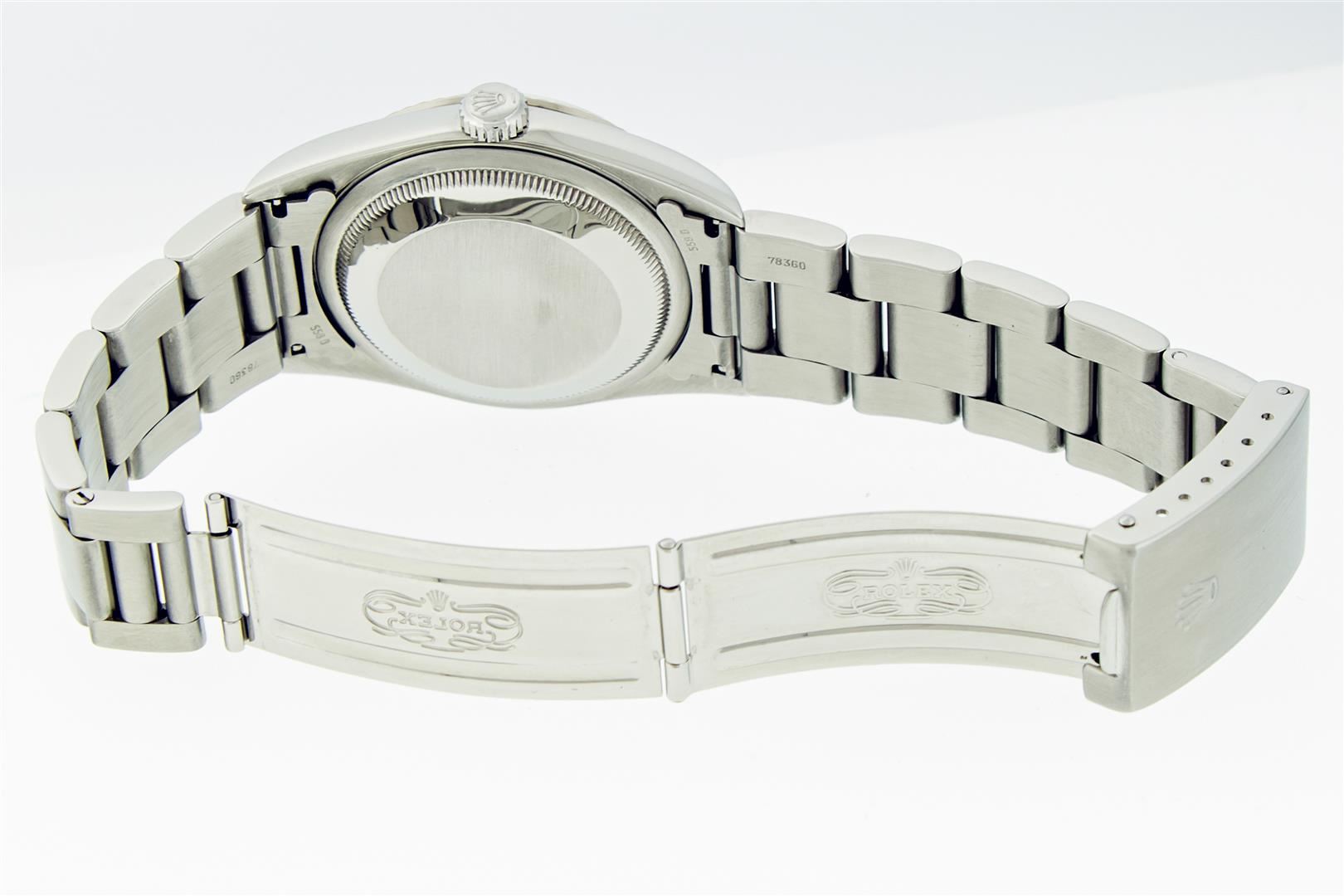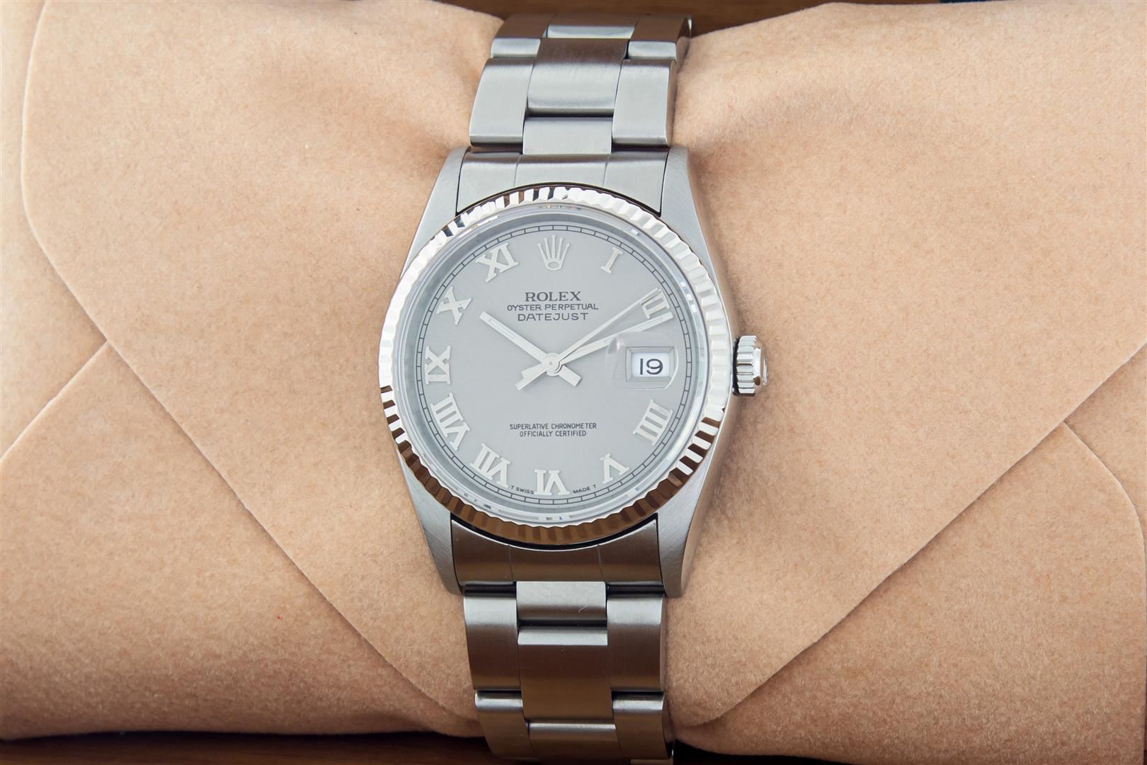 One Men's Pre Owned Rolex Stainless Steel Datejust Polished Bright with Satin Finish, Serviced & Electronically Tested, Rolex Stainless Steel Case: 36mm, Rolex Stainless Steel Crown, Rolex Bezel: 18K White Gold Fluted Bezel. Custom Crystal: New Sapphire With Magnified Date Window. Rolex Movement: Automatic Winding Movement Caliber 3135. Rolex Dial: Slate Grey Roman With Square Track. Date Window: 3 O'clock Position Date Display, Quickset, Model: Quickset Datejust. Condition: G-6 Extra Fine. Rolex Bracelet: Stainless Steel Oyster Band. Bright Polish & Satin Finish. 7.0 Inch Length, Adjustable. Standard Clasp, With Rolex Logo. This Pre Owned Watch Comes With A Rolex Box, Rolex Booklets, and Rolex Wallet.