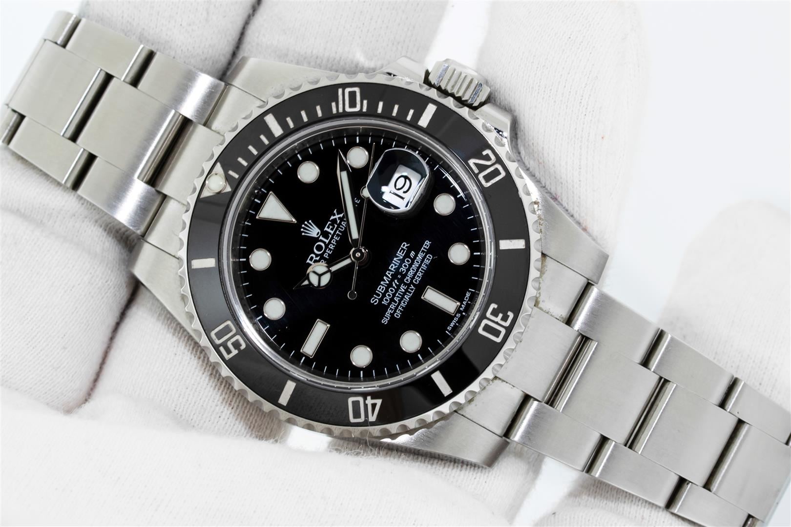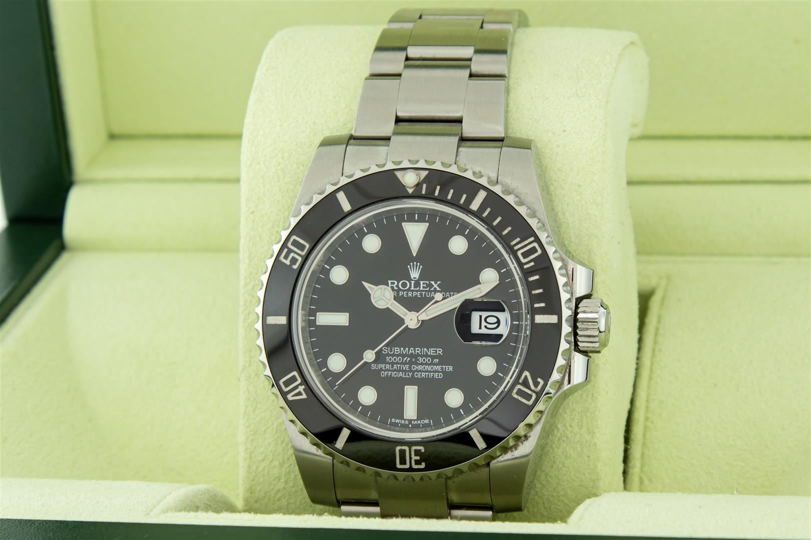 One Mens Pre Owned Ceramic Rolex Submariner With Date Polished, Serviced & Electronically Tested, Rolex Stainless Steel Case: 40mm, Rolex Stainless Steel Crown, Rolex Bezel: Stainless Steel Rotatable Bezel With Black Ceramic Insert. Rolex Crystal: Sapphire Cyclops Lens. Rolex Movement: Automatic Winding Movement Caliber 3135. Rolex Dial: Rolex Black Submariner Dial with Luminous Index Hour Markers. Date Window: 3 O'Clock Position Date Display, Model: Ceramic Submariner, Quickset, Condition: G-6 Extra Fine. Rolex Bracelet: Stainless Steel Oyster Band. Bright Polish & Satin Finish. 7.0 Inch Length, Adjustable. Standard Clasp, With Rolex Logo. This Watch Comes With A Rolex Box.