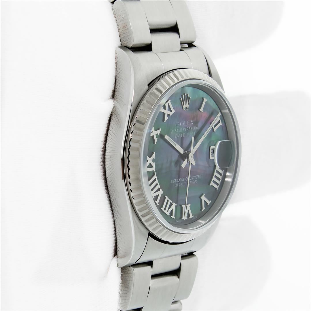 One Men's Pre Owned Stainless Steel Rolex Datejust Polished Bright with Satin Finish, This Watch Has Been Serviced & Electronically Tested, Rolex Stainless Steel Case: 36mm, Rolex Stainless Steel Crown, Rolex Bezel: White Gold Fluted Bezel. Custom Crystal: New Sapphire with Date Window. Custom Hands: New Luminescent Hands. Rolex Movement: Automatic Winding Movement Caliber 3135. Custom Dial: Refinished Tahitian MOP Dial with Roman Numerical Hour Markers, Diamond Count: 10 Diamonds On Dial, G To H In Color, SI-VS Clarity. Date Window: 3 O'Clock Position Date Display, Quickset, Model: Datejust, Condition: G-6 Extra Fine. Rolex Bracelet: Stainless Steel Oyster Band. Bright Polish & Satin Finish. 7.0 Inch Length, Adjustable. Standard Clasp, with Rolex Logo. This Watch Has Been Serviced Time Tested And Is In Excellent Condition It Is Free Of All Scratches And Dents.