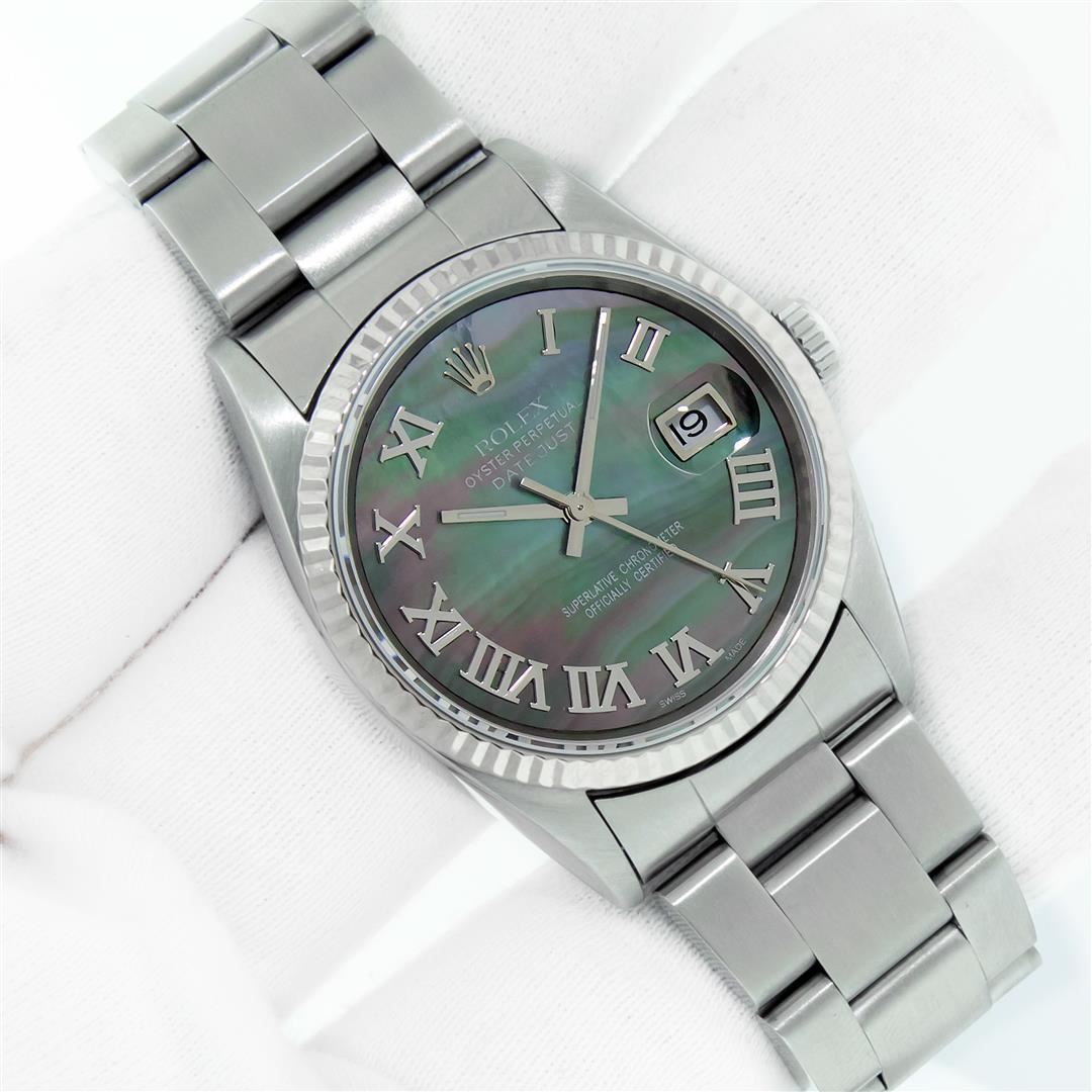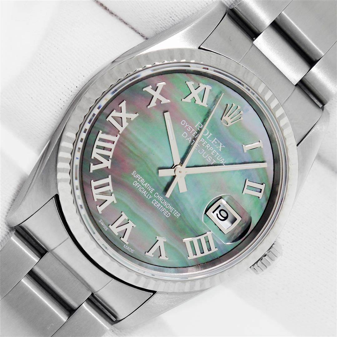 One Men's Pre Owned Stainless Steel Rolex Datejust Polished Bright with Satin Finish, This Watch Has Been Serviced & Electronically Tested, Rolex Stainless Steel Case: 36mm, Rolex Stainless Steel Crown, Rolex Bezel: White Gold Fluted Bezel. Custom Crystal: New Sapphire with Date Window. Custom Hands: New Luminescent Hands. Rolex Movement: Automatic Winding Movement Caliber 3135. Custom Dial: Refinished Tahitian MOP Dial with Roman Numerical Hour Markers, Diamond Count: 10 Diamonds On Dial, G To H In Color, SI-VS Clarity. Date Window: 3 O'Clock Position Date Display, Quickset, Model: Datejust, Condition: G-6 Extra Fine. Rolex Bracelet: Stainless Steel Oyster Band. Bright Polish & Satin Finish. 7.0 Inch Length, Adjustable. Standard Clasp, with Rolex Logo. This Watch Has Been Serviced Time Tested And Is In Excellent Condition It Is Free Of All Scratches And Dents.