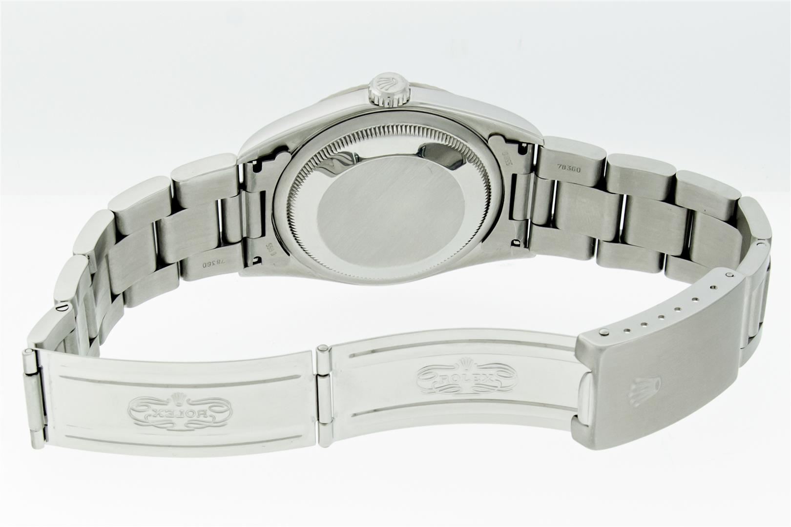 One Men's Pre Owned Stainless Steel Rolex Datejust Polished Bright with Satin Finish, This Watch Has Been Serviced & Electronically Tested, Rolex Stainless Steel Case: 36mm, Rolex Stainless Steel Crown, Rolex Bezel: White Gold Fluted Bezel. Custom Crystal: New Sapphire with Date Window. Custom Hands: New Luminescent Hands. Rolex Movement: Automatic Winding Movement Caliber 3135. Custom Dial: Refinished Tahitian MOP Dial with Roman Numerical Hour Markers, Diamond Count: 10 Diamonds On Dial, G To H In Color, SI-VS Clarity. Date Window: 3 O'Clock Position Date Display, Quickset, Model: Datejust, Condition: G-6 Extra Fine. Rolex Bracelet: Stainless Steel Oyster Band. Bright Polish & Satin Finish. 7.0 Inch Length, Adjustable. Standard Clasp, with Rolex Logo. This Watch Has Been Serviced Time Tested And Is In Excellent Condition It Is Free Of All Scratches And Dents.