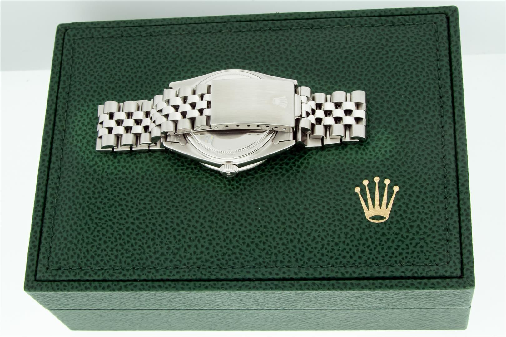 One Men's Rolex Stainless Steel Datejust Polished Bright with Satin Finish, This Watch Has Been Serviced & Electronically Tested, Rolex Stainless Steel Case: 36mm, Rolex Stainless Steel Crown, Custom Bezel: New 18K White Gold Pyramid Diamond Bezel, Diamond Count: 24 Diamonds On Bezel, Total Weight .70 Carat, Clarity: SI-VS, Color: G to H. Custom Crystal: New Sapphire With Magnified Date Window. Custom Hands: New Luminescent Hands. Rolex Movement: Automatic Winding Movement. Custom Dial: Refinished To Tahitian Mother Of Pearl With Added Diamonds, Diamond Count: 10 Baguette Diamonds On Dial, Color: G to H, Clarity: VS2-SI1. Date Window: 3 O'clock Position Date Display, Quickset, Model: Datejust. Condition: G-6 Extra Fine. Rolex Bracelet: Stainless Steel Jubilee Band. Bright Polish & Satin Finish. 7.0 Inch Length, Adjustable. Standard Clasp, With Rolex Logo. This Pre Owned Watch Has Been Serviced Time Tested And Is In Excellent Condition It Is Free Of All Scratches And Dents. This Watch Comes With A Rolex Box.
