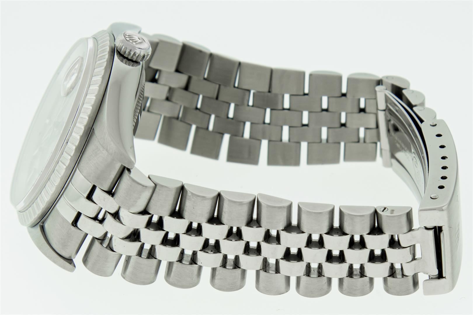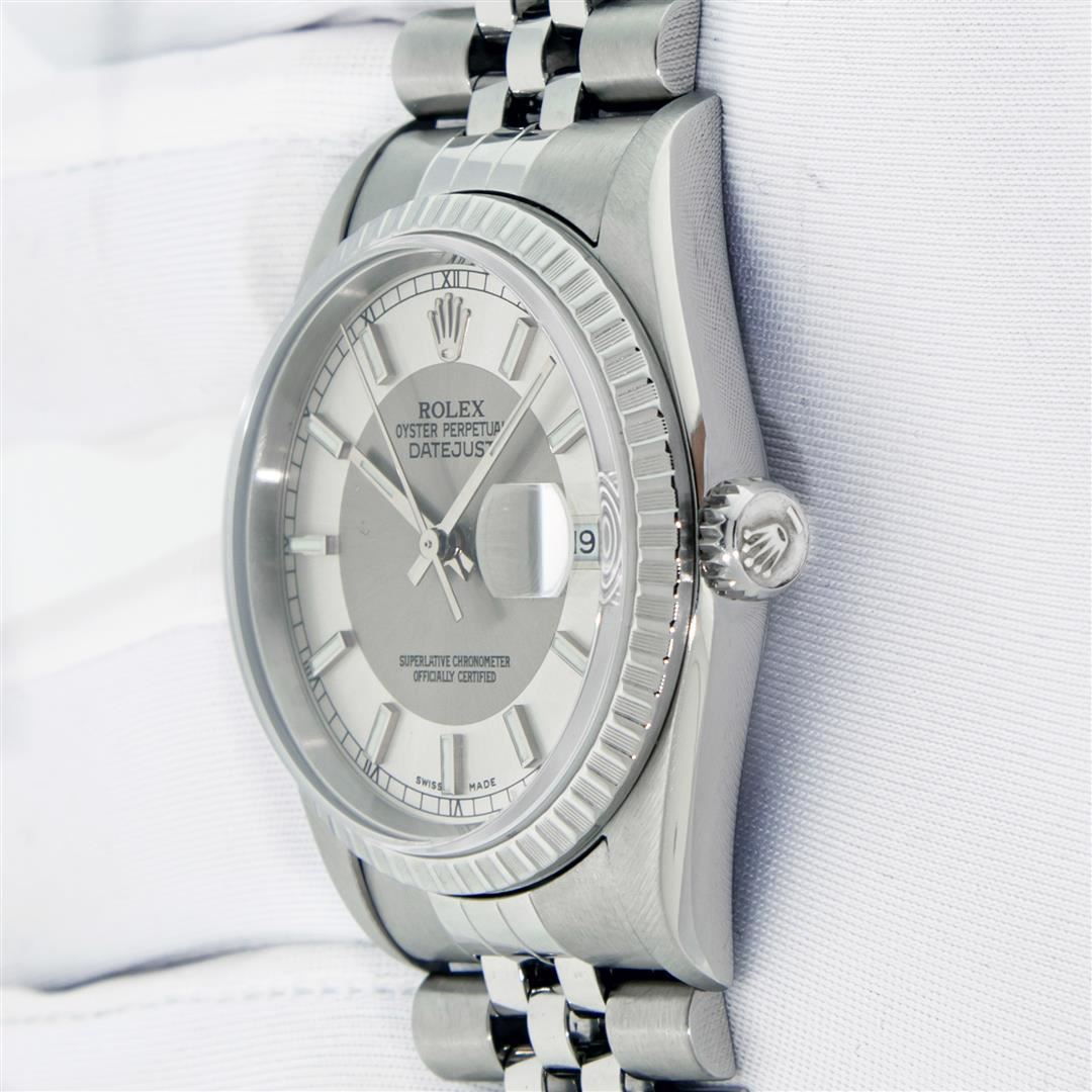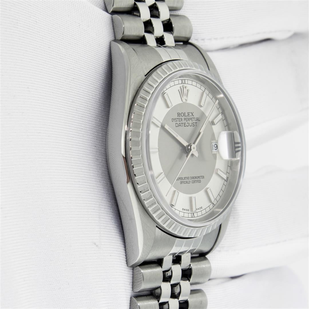 One Men's Pre Owned Rolex Stainless Steel Datejust Polished Bright with Satin Finish, Serviced & Electronically Tested, Rolex Stainless Steel Case: 36mm, Rolex Stainless Steel Crown, Rolex Bezel: 18K White Gold Fluted Bezel. Custom Crystal: New Sapphire with Magnified Date Window. Rolex Movement: Automatic Winding Movement Caliber 3135. Rolex Dial: Silver Tuxedo Index with Roman Square Track. Hands: White Lumi Hands. Date Window: 3 O'Clock Position Date Display, Quickset, Model: Quickset Datejust. Condition: G-6 Extra Fine. Rolex Bracelet: Stainless Steel Jubilee Band. Bright Polish & Satin Finish. 7.0 Inch Length, Adjustable. Standard Clasp, with Rolex Logo. This Pre Owned Watch Has Been Serviced Time Tested And Is In Excellent Condition It Is Free Of All Scratches And Dents.
