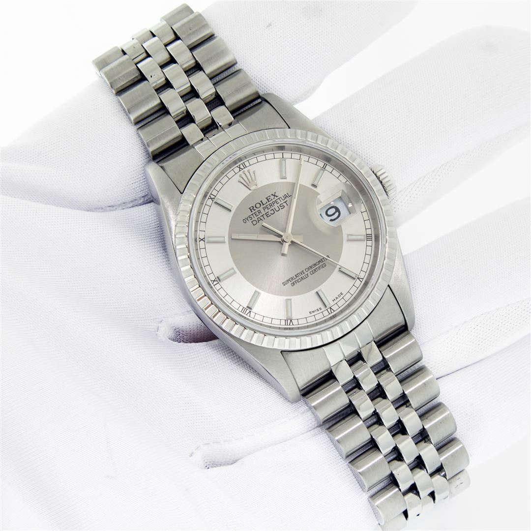 One Men's Pre Owned Rolex Stainless Steel Datejust Polished Bright with Satin Finish, Serviced & Electronically Tested, Rolex Stainless Steel Case: 36mm, Rolex Stainless Steel Crown, Rolex Bezel: 18K White Gold Fluted Bezel. Custom Crystal: New Sapphire with Magnified Date Window. Rolex Movement: Automatic Winding Movement Caliber 3135. Rolex Dial: Silver Tuxedo Index with Roman Square Track. Hands: White Lumi Hands. Date Window: 3 O'Clock Position Date Display, Quickset, Model: Quickset Datejust. Condition: G-6 Extra Fine. Rolex Bracelet: Stainless Steel Jubilee Band. Bright Polish & Satin Finish. 7.0 Inch Length, Adjustable. Standard Clasp, with Rolex Logo. This Pre Owned Watch Has Been Serviced Time Tested And Is In Excellent Condition It Is Free Of All Scratches And Dents.