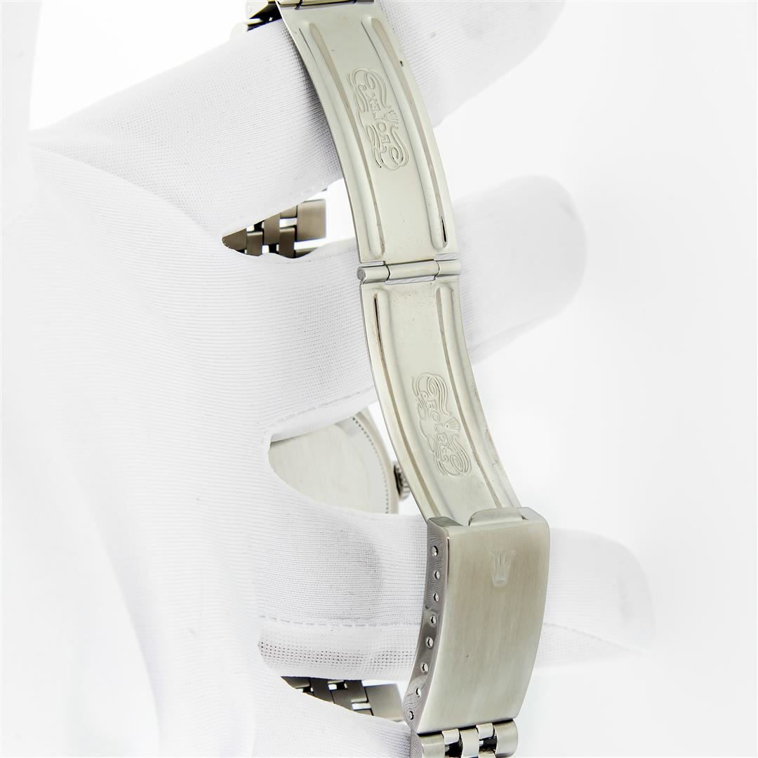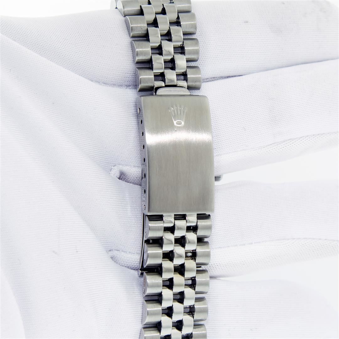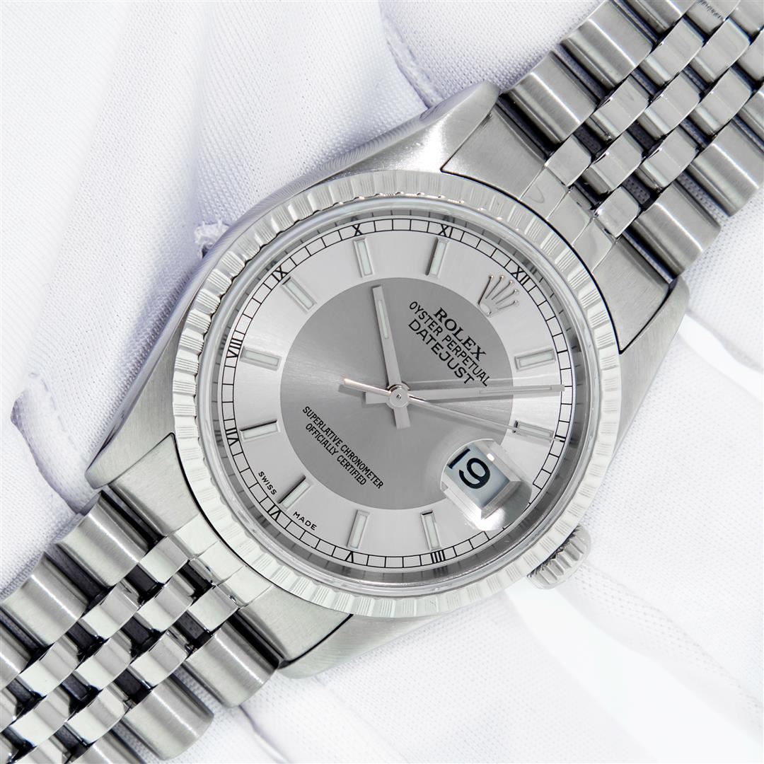 One Men's Pre Owned Rolex Stainless Steel Datejust Polished Bright with Satin Finish, Serviced & Electronically Tested, Rolex Stainless Steel Case: 36mm, Rolex Stainless Steel Crown, Rolex Bezel: 18K White Gold Fluted Bezel. Custom Crystal: New Sapphire with Magnified Date Window. Rolex Movement: Automatic Winding Movement Caliber 3135. Rolex Dial: Silver Tuxedo Index with Roman Square Track. Hands: White Lumi Hands. Date Window: 3 O'Clock Position Date Display, Quickset, Model: Quickset Datejust. Condition: G-6 Extra Fine. Rolex Bracelet: Stainless Steel Jubilee Band. Bright Polish & Satin Finish. 7.0 Inch Length, Adjustable. Standard Clasp, with Rolex Logo. This Pre Owned Watch Has Been Serviced Time Tested And Is In Excellent Condition It Is Free Of All Scratches And Dents.