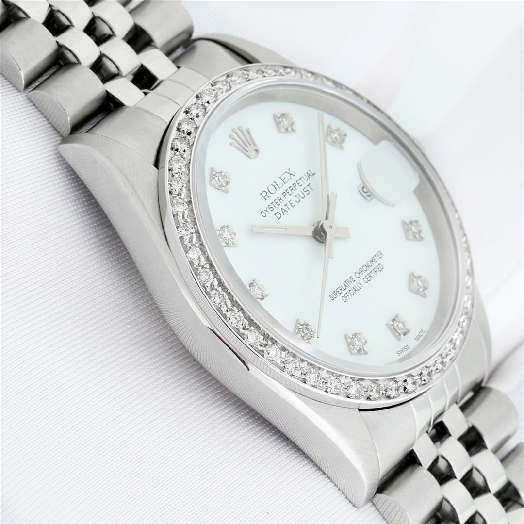 One Men's Stainless Steel Rolex Datejust Polished Bright with Satin Finish, This Watch Has Been Serviced & Electronically Tested, Rolex Stainless Steel Case: 36mm, Rolex Stainless Steel Crown, Custom Bezel: New 18K White Gold Beadset Diamond Bezel, Diamond Count: 44 Diamonds. Total Weight 1.00 Carat, Clarity: SI-VS, Color: G to H. Custom Crystal: New Sapphire with Magnified Date Window. Custom Hands: New Luminescent Hands. Rolex Movement: Automatic Winding Movement Caliber 3135. Custom Dial: Refinished To White with Custom Added Diamonds, Diamond Count: 10 Diamonds On Dial, G To H In Color, SI-VS Clarity. Date Window: 3 O'Clock Position Date Display, Quickset, Model: Datejust, Condition: G-6 Extra Fine. Rolex Bracelet: Stainless Steel Jubilee Band. Bright Polish & Satin Finish. 7.0 Inch Length, Adjustable. Standard Clasp, with Rolex Logo. This Pre Owned Watch Has Been Serviced Time Tested And Is In Excellent Condition It Is Free Of All Scratches And Dents.