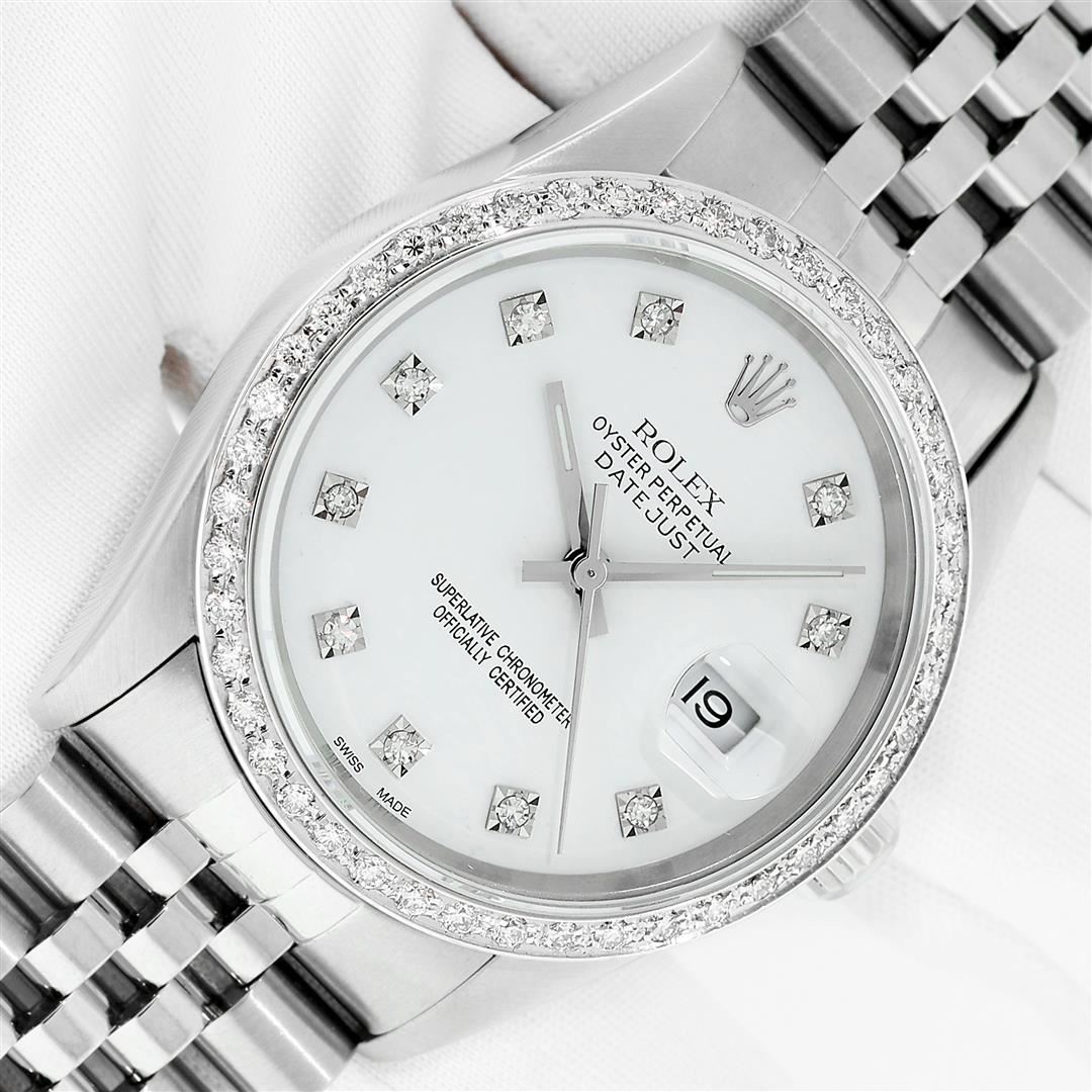 One Men's Stainless Steel Rolex Datejust Polished Bright with Satin Finish, This Watch Has Been Serviced & Electronically Tested, Rolex Stainless Steel Case: 36mm, Rolex Stainless Steel Crown, Custom Bezel: New 18K White Gold Beadset Diamond Bezel, Diamond Count: 44 Diamonds. Total Weight 1.00 Carat, Clarity: SI-VS, Color: G to H. Custom Crystal: New Sapphire with Magnified Date Window. Custom Hands: New Luminescent Hands. Rolex Movement: Automatic Winding Movement Caliber 3135. Custom Dial: Refinished To White with Custom Added Diamonds, Diamond Count: 10 Diamonds On Dial, G To H In Color, SI-VS Clarity. Date Window: 3 O'Clock Position Date Display, Quickset, Model: Datejust, Condition: G-6 Extra Fine. Rolex Bracelet: Stainless Steel Jubilee Band. Bright Polish & Satin Finish. 7.0 Inch Length, Adjustable. Standard Clasp, with Rolex Logo. This Pre Owned Watch Has Been Serviced Time Tested And Is In Excellent Condition It Is Free Of All Scratches And Dents.