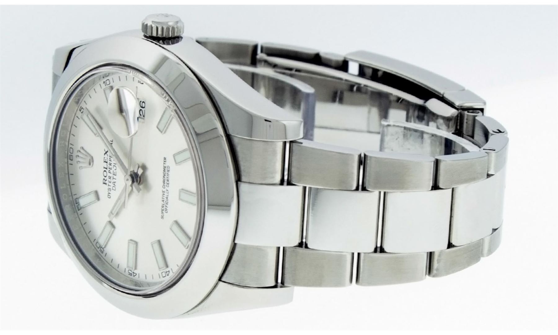 One Men's Rolex Datejust 2 41MM Polished, Serviced & Electronically Tested, Rolex Stainless Steel Case: 41mm, Stainless Steel Crown, Rolex Bezel: Stainless Steel Smooth Bezel, Crystal: Sapphire With Magnified Date Window. Hands: Luminescent Hands. Rolex Movement: Automatic Winding Movement 3136. Rolex Dial: White Index With Dash Track. Date Window: 3 O'Clock Position Date Display, Quickset, Model: Datejust 2. Condition: G-6 Extra Fine. Rolex Bracelet: Stainless Steel Oyster Band. Bright Polish & Satin Finish. 7.0 Inch Length, Adjustable. Standard Clasp, With Rolex Logo. This Pre Owned Watch Has Been Serviced Time Tested And Is In Excellent Condition It Is Free Of All Scratches And Dents.