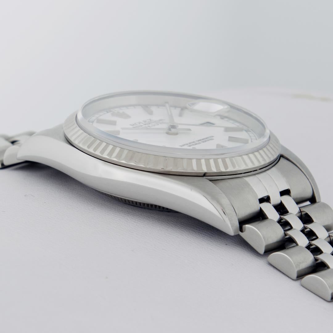 One Men's Rolex Quickset Stainless Steel Datejust Polished Bright with Satin Finish, Serviced & Electronically Tested, Rolex Stainless Steel Case: 36mm, Rolex Stainless Steel Crown, Rolex Bezel: 14K White Gold Fluted Bezel. Crystal: Sapphire With Magnified Date Window. Custom Hands: New Lumi Hands. Rolex Movement: Automatic Winding Movement Caliber 3135. Custom Dial: Refinished To White With Index Hour Markers And Square Roman Track. Date Window: 3 O'Clock Position Date Display, Quickset, Model: Quickset Datejust. Condition: G-6 Extra Fine. Rolex Bracelet: Stainless Steel Jubilee Band. Bright Polish & Satin Finish. 7.0 Inch Length, Adjustable. Standard Clasp, With Rolex Logo. This Pre Owned Watch Has Been Serviced Time Tested And Is In Excellent Condition It Is Free Of All Scratches And Dents.