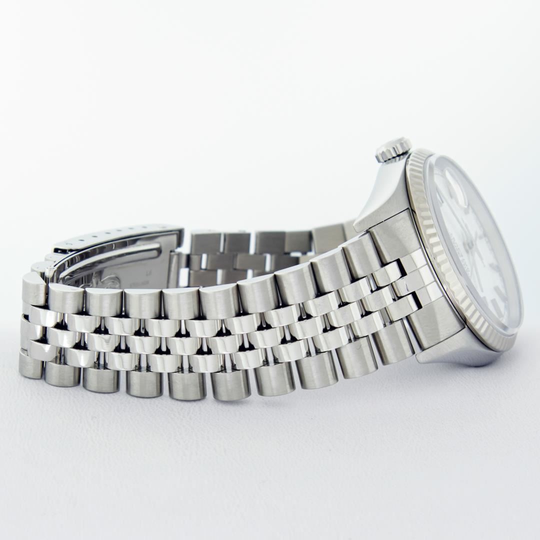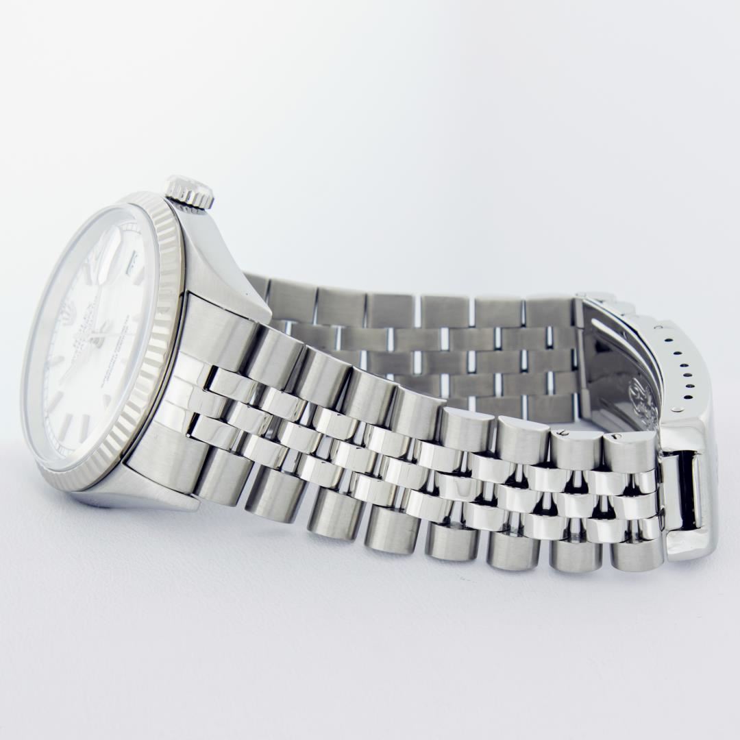 One Men's Rolex Quickset Stainless Steel Datejust Polished Bright with Satin Finish, Serviced & Electronically Tested, Rolex Stainless Steel Case: 36mm, Rolex Stainless Steel Crown, Rolex Bezel: 14K White Gold Fluted Bezel. Crystal: Sapphire With Magnified Date Window. Custom Hands: New Lumi Hands. Rolex Movement: Automatic Winding Movement Caliber 3135. Custom Dial: Refinished To White With Index Hour Markers And Square Roman Track. Date Window: 3 O'Clock Position Date Display, Quickset, Model: Quickset Datejust. Condition: G-6 Extra Fine. Rolex Bracelet: Stainless Steel Jubilee Band. Bright Polish & Satin Finish. 7.0 Inch Length, Adjustable. Standard Clasp, With Rolex Logo. This Pre Owned Watch Has Been Serviced Time Tested And Is In Excellent Condition It Is Free Of All Scratches And Dents.