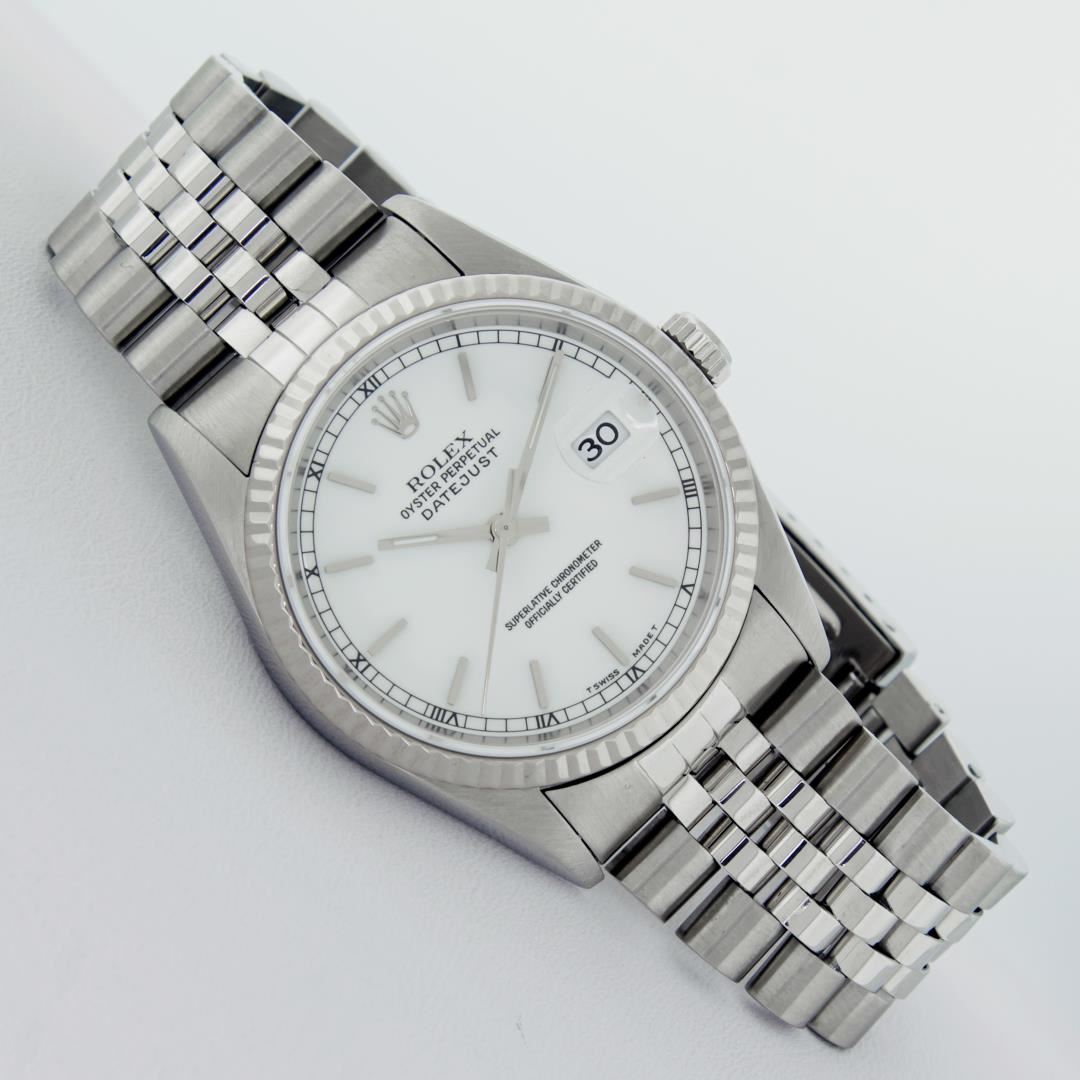 One Men's Rolex Quickset Stainless Steel Datejust Polished Bright with Satin Finish, Serviced & Electronically Tested, Rolex Stainless Steel Case: 36mm, Rolex Stainless Steel Crown, Rolex Bezel: 14K White Gold Fluted Bezel. Crystal: Sapphire With Magnified Date Window. Custom Hands: New Lumi Hands. Rolex Movement: Automatic Winding Movement Caliber 3135. Custom Dial: Refinished To White With Index Hour Markers And Square Roman Track. Date Window: 3 O'Clock Position Date Display, Quickset, Model: Quickset Datejust. Condition: G-6 Extra Fine. Rolex Bracelet: Stainless Steel Jubilee Band. Bright Polish & Satin Finish. 7.0 Inch Length, Adjustable. Standard Clasp, With Rolex Logo. This Pre Owned Watch Has Been Serviced Time Tested And Is In Excellent Condition It Is Free Of All Scratches And Dents.