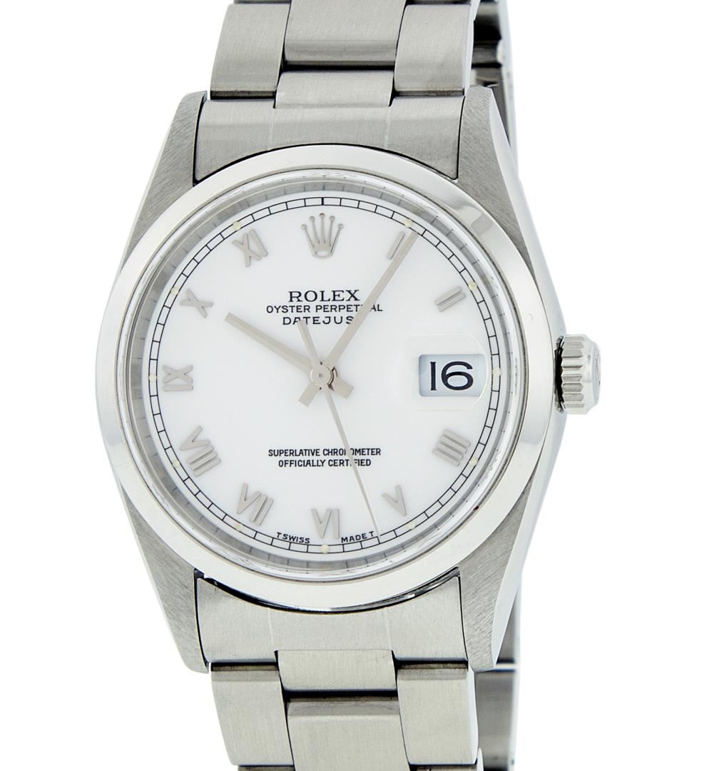 One Men's Rolex Pre Owned Quickset Stainless Steel Datejust Polished Bright with Satin Finish, Serviced & Electronically Tested, Rolex Stainless Steel Case: 36mm, Rolex Stainless Steel Crown, Rolex Bezel: Stainless Steel Smooth Bezel. Crystal: Sapphire With Magnified Date Window. Rolex Movement: Automatic Winding Movement Caliber 3135. Rolex Dial: White Roman With Square Track and Lumi Dot. Date Window: 3 O'Clock Position Date Display, Quickset, Model: Quickset Datejust. Condition: G-6 Extra Fine. Rolex Bracelet: Stainless Steel Oyster Band. Bright Polish & Satin Finish. 7.0 Inch Length, Adjustable. Standard Clasp, With Rolex Logo. This Pre Owned Watch Has Been Serviced Time Tested And Is In Excellent Condition It Is Free Of All Scratches And Dents.