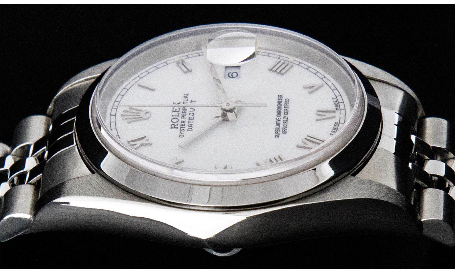 One Men's Rolex Pre Owned Quickset Stainless Steel Datejust Polished Bright with Satin Finish, Serviced & Electronically Tested, Rolex Stainless Steel Case: 36mm, Rolex Stainless Steel Crown, Rolex Bezel: Stainless Steel Smooth Bezel. Crystal: Sapphire With Magnified Date Window. Rolex Movement: Automatic Winding Movement Caliber 3135. Rolex Dial: White Roman With Square Track and Lumi Dot. Date Window: 3 O'Clock Position Date Display, Quickset, Model: Quickset Datejust. Condition: G-6 Extra Fine. Rolex Bracelet: Stainless Steel Jubilee Band. Bright Polish & Satin Finish. 7.0 Inch Length, Adjustable. Standard Clasp, With Rolex Logo. This Pre Owned Watch Has Been Serviced Time Tested And Is In Excellent Condition It Is Free Of All Scratches And Dents.