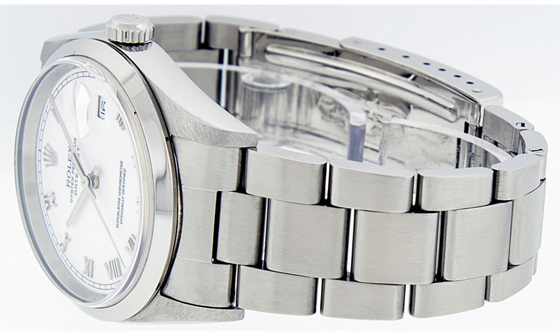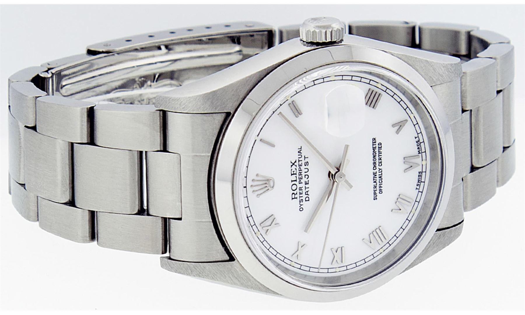 One Men's Rolex Pre Owned Quickset Stainless Steel Datejust Polished Bright with Satin Finish, Serviced & Electronically Tested, Rolex Stainless Steel Case: 36mm, Rolex Stainless Steel Crown, Rolex Bezel: Stainless Steel Smooth Bezel. Crystal: Sapphire With Magnified Date Window. Rolex Movement: Automatic Winding Movement Caliber 3135. Rolex Dial: White Roman With Square Track and Lumi Dot. Date Window: 3 O'Clock Position Date Display, Quickset, Model: Quickset Datejust. Condition: G-6 Extra Fine. Rolex Bracelet: Stainless Steel Oyster Band. Bright Polish & Satin Finish. 7.0 Inch Length, Adjustable. Standard Clasp, With Rolex Logo. This Pre Owned Watch Has Been Serviced Time Tested And Is In Excellent Condition It Is Free Of All Scratches And Dents.
