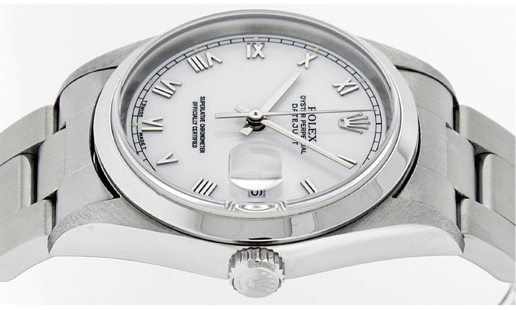 One Men's Rolex Pre Owned Quickset Stainless Steel Datejust Polished Bright with Satin Finish, Serviced & Electronically Tested, Rolex Stainless Steel Case: 36mm, Rolex Stainless Steel Crown, Rolex Bezel: Stainless Steel Smooth Bezel. Crystal: Sapphire With Magnified Date Window. Rolex Movement: Automatic Winding Movement Caliber 3135. Rolex Dial: White Roman With Square Track and Lumi Dot. Date Window: 3 O'Clock Position Date Display, Quickset, Model: Quickset Datejust. Condition: G-6 Extra Fine. Rolex Bracelet: Stainless Steel Oyster Band. Bright Polish & Satin Finish. 7.0 Inch Length, Adjustable. Standard Clasp, With Rolex Logo. This Pre Owned Watch Has Been Serviced Time Tested And Is In Excellent Condition It Is Free Of All Scratches And Dents.