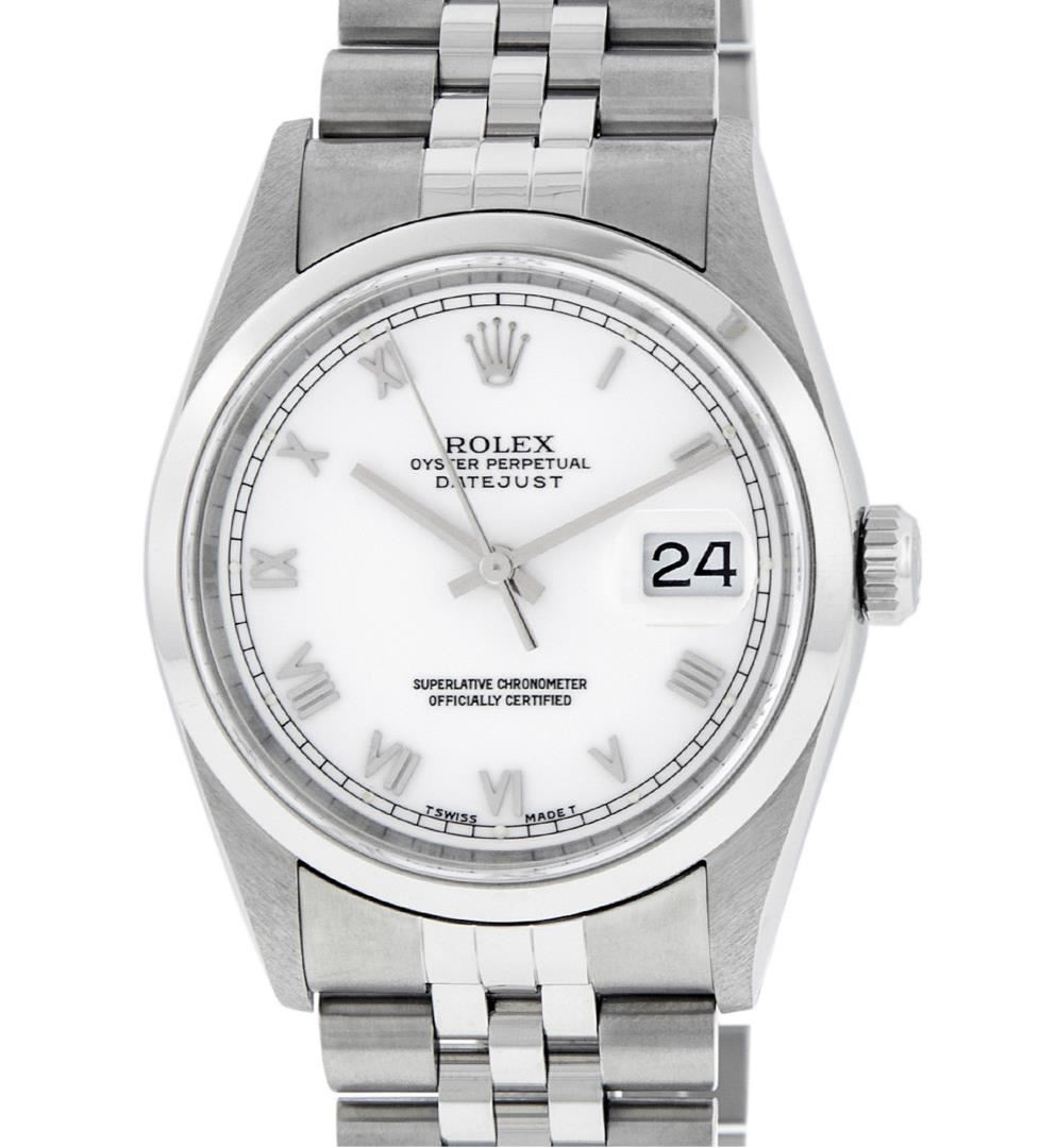One Men's Rolex Pre Owned Quickset Stainless Steel Datejust Polished Bright with Satin Finish, Serviced & Electronically Tested, Rolex Stainless Steel Case: 36mm, Rolex Stainless Steel Crown, Rolex Bezel: Stainless Steel Smooth Bezel. Crystal: Sapphire With Magnified Date Window. Rolex Movement: Automatic Winding Movement Caliber 3135. Rolex Dial: White Roman With Square Track and Lumi Dot. Date Window: 3 O'Clock Position Date Display, Quickset, Model: Quickset Datejust. Condition: G-6 Extra Fine. Rolex Bracelet: Stainless Steel Jubilee Band. Bright Polish & Satin Finish. 7.0 Inch Length, Adjustable. Standard Clasp, With Rolex Logo. This Pre Owned Watch Has Been Serviced Time Tested And Is In Excellent Condition It Is Free Of All Scratches And Dents.