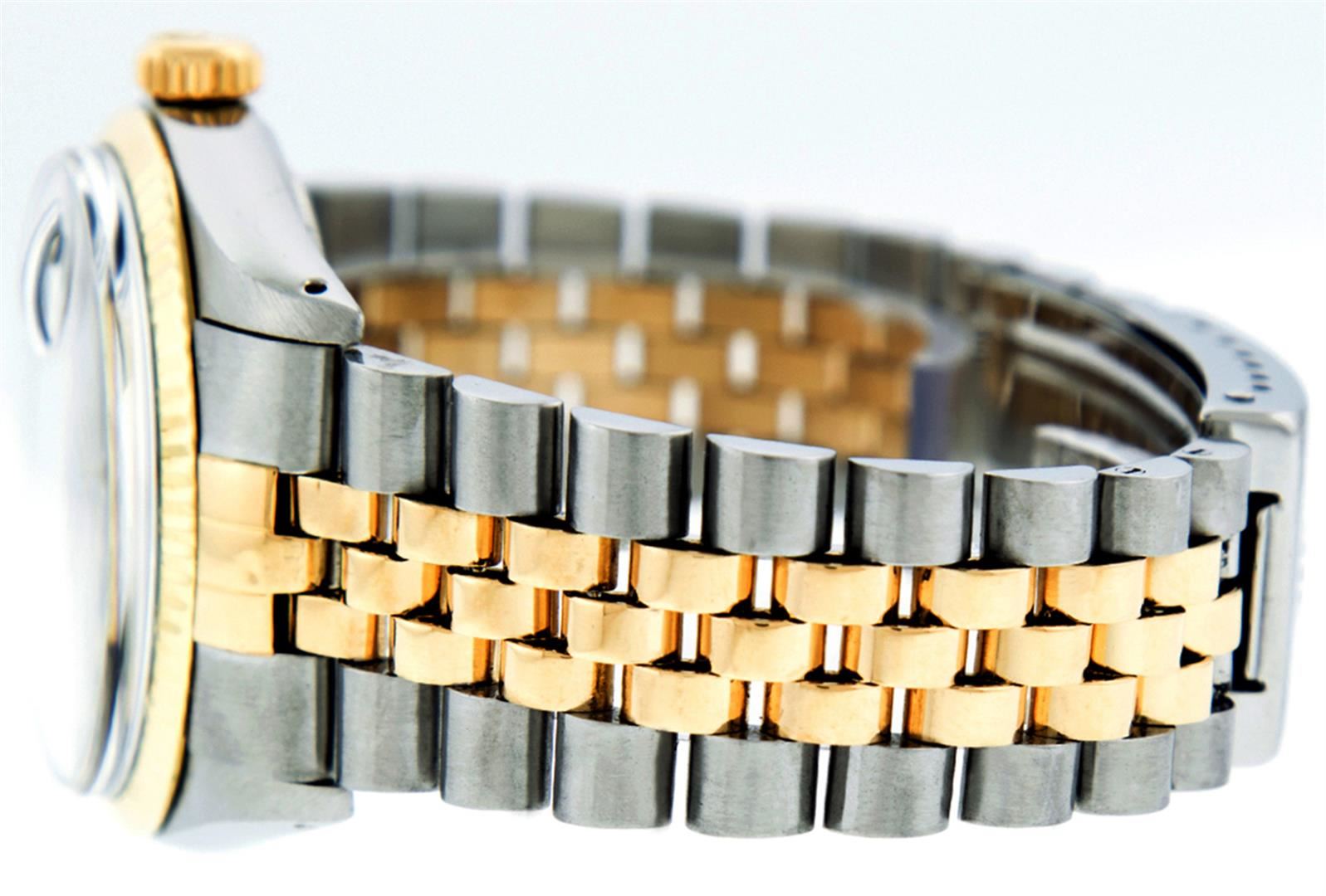 One Mens 14K Yellow Gold Two Tone Rolex Datejust Polished, Serviced & Electronically Tested, 14K Yellow Gold & Stainless Steel Case: 36mm, 14K Yellow Gold Crown, Bezel: 18K Yellow Gold Fluted Bezel. Custom Crystal: New Acrylic Cyclops Lens. Custom Hands: New Luminecent Hands. Movement: Automatic Winding Movement Caliber 3035. Custom Dial: Black Dial Set With Diamond Hour Markers And Square Roman Track, Diamond Count: 10 Diamonds in Dial G To H In Color, Si-VS Clarity. Date Window: 3 O'Clock Position Date Display, Quickset, Model: 16013 Condition: G-6 Extra Fine. Bracelet: Two Tone 14K Yellow Gold & Stainless Steel Jubilee. Bright Polish. 7.0 Inch Length, Adjustable. Standard Clasp, With Rolex Logo. This Watch Has Been Serviced And Polished It Is Free Of All Scratches And Dents.