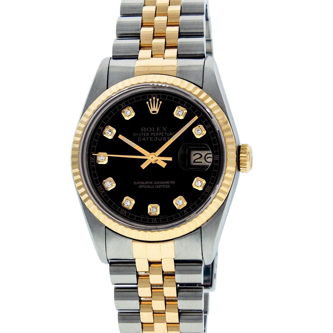 One Mens 14K Yellow Gold Two Tone Rolex Datejust Polished, Serviced & Electronically Tested, 14K Yellow Gold & Stainless Steel Case: 36mm, 14K Yellow Gold Crown, Bezel: 18K Yellow Gold Fluted Bezel. Custom Crystal: New Acrylic Cyclops Lens. Custom Hands: New Luminecent Hands. Movement: Automatic Winding Movement Caliber 3035. Custom Dial: Black Dial Set With Diamond Hour Markers And Square Roman Track, Diamond Count: 10 Diamonds in Dial G To H In Color, Si-VS Clarity. Date Window: 3 O'Clock Position Date Display, Quickset, Model: 16013 Condition: G-6 Extra Fine. Bracelet: Two Tone 14K Yellow Gold & Stainless Steel Jubilee. Bright Polish. 7.0 Inch Length, Adjustable. Standard Clasp, With Rolex Logo. This Watch Has Been Serviced And Polished It Is Free Of All Scratches And Dents.