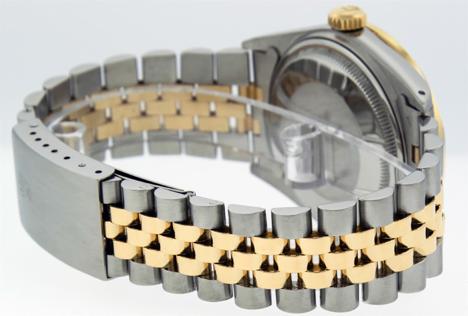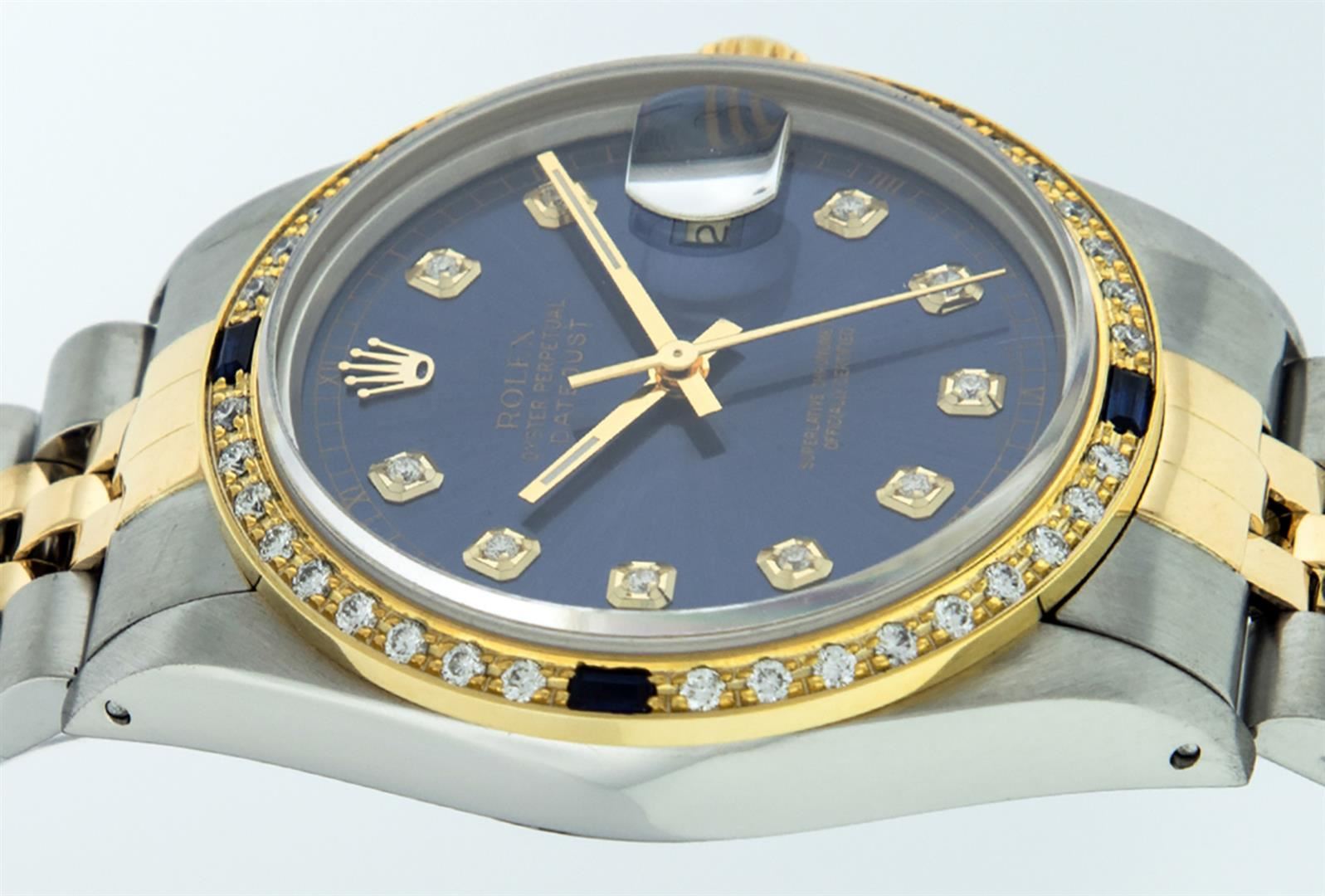 One Men's 14K Yellow Gold Two Tone Rolex Datejust Polished, Serviced & Electronically Tested, 14K Yellow Gold & Stainless Steel Case: 36mm, 14K Yellow Gold Crown, Custom Bezel: New 18K Yellow Gold Sapphire Beadset Diamond Bezel, Diamond Count:�36 Diamonds + 4 Sapphires,�Total Weight 1.00 Carat, Clarity: SI-VS, Color: G to H. Custom Crystal: New Synthetic Sapphire Cyclops Lens. Custom Hands: New Luminescent Hands. Movement: Automatic Winding Movement Caliber 3035. Custom Dial: Blue�With Diamond Hour Markers. Diamond Count: 10 Diamonds, Clarity: SI-VS, Color: Color G to H Date Window: 3 O'clock Position Date Display,� Quickset, Model: 16013 Condition: G-6 Extra Fine. Bracelet: Two Tone 14K Yellow Gold & Stainless Steel Jubilee. Bright Polish.� 7.0 Inch Length, Adjustable. Standard Clasp, With Rolex Logo. This Watch Has Been Serviced Time Tested And Is In Excellent Condition It Is Free Of All Scratches And Dents.