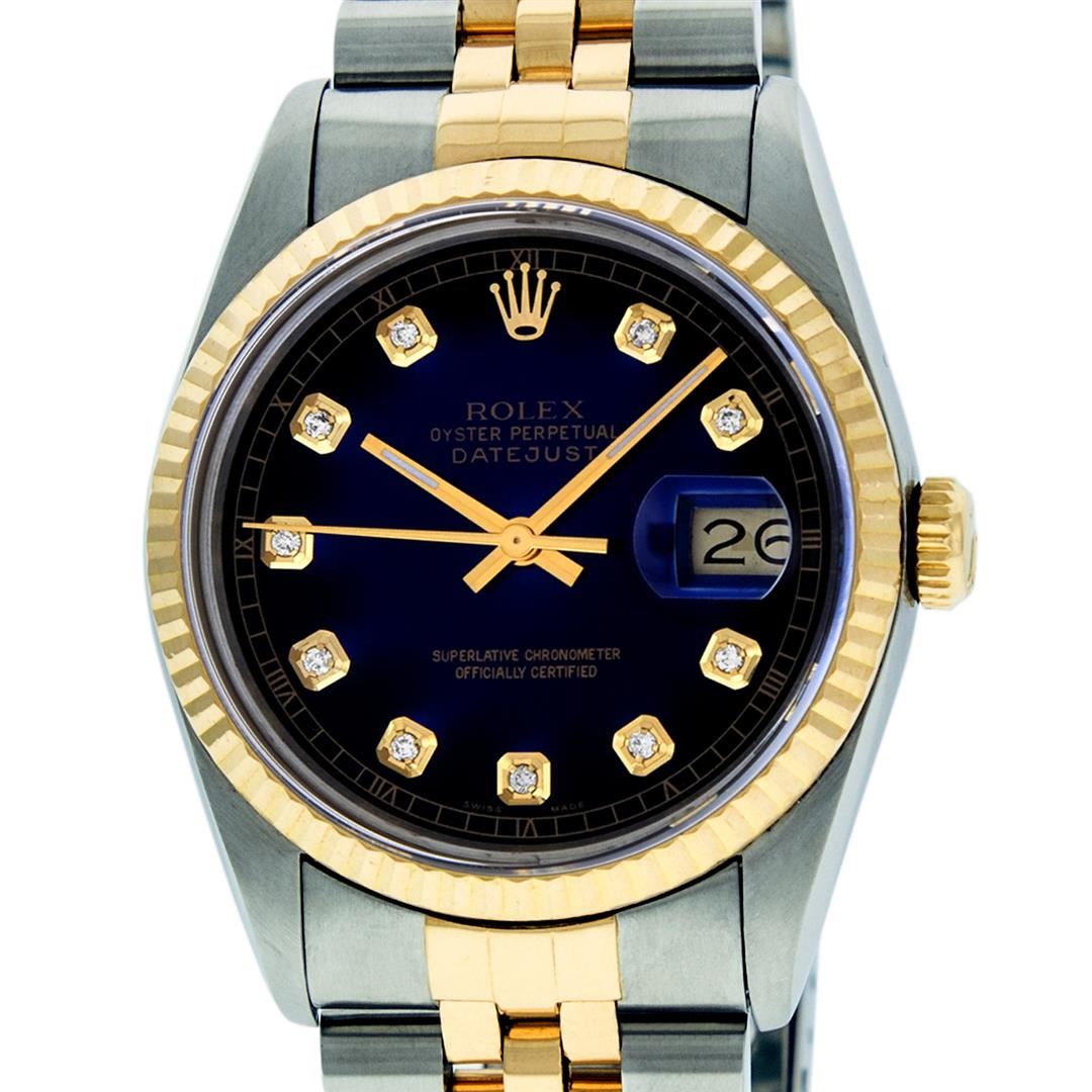 One Men's 14K Yellow Gold Two Tone Rolex Datejust Polished, Serviced & Electronically Tested, 14K Yellow Gold & Stainless Steel Case: 36mm, 14K Yellow Gold Crown, Bezel: 18K Yellow Gold Fluted Bezel. Custom Crystal: New Acrylic Cyclops Lens. Custom Hands: New Luminescent Hands. Movement: Automatic Winding Movement Caliber 3035. Custom Dial: Blue Vignette Dial Set With Diamond Hour Markers And Square Roman Track, Diamond Count: 10 Diamonds in Dial G To H In Color, Si-VS Clarity. Date Window: 3 O'Clock Position Date Display, Quickset, Model: 16013 Condition: G-6 Extra Fine. Bracelet: Two Tone 14K Yellow Gold & Stainless Steel Jubilee. Bright Polish. 7.0 Inch Length, Adjustable. Standard Clasp, With Rolex Logo. This Watch Has Been Serviced And Polished It Is Free Of All Scratches And Dents.