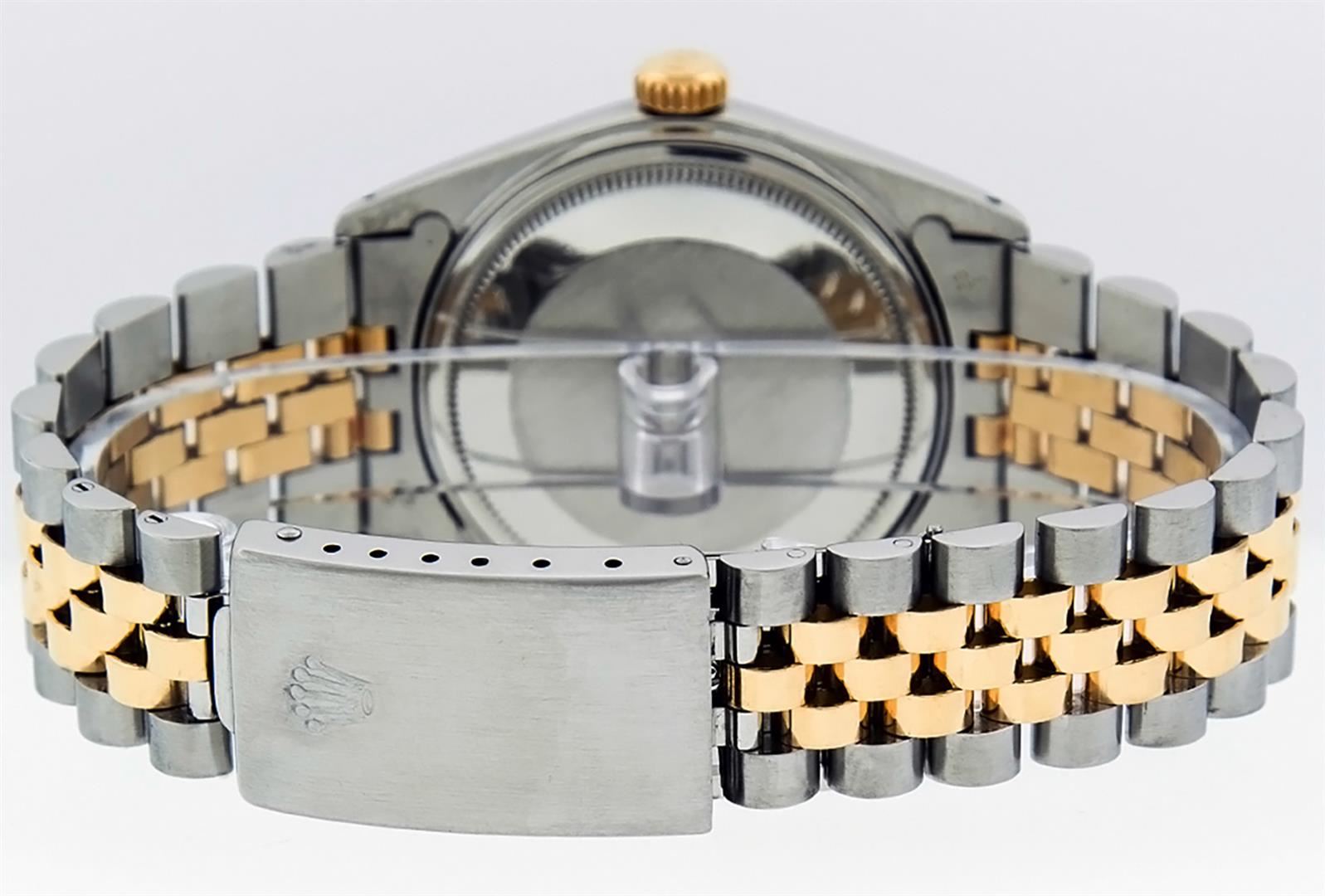 One Men's 14K Yellow Gold Two Tone Rolex Datejust Polished, Serviced & Electronically Tested, 14K Yellow Gold & Stainless Steel Case: 36mm, 14K Yellow Gold Crown, Bezel: 14K Yellow Gold Fluted Bezel. Custom Crystal: New Acrylic Cyclops Lens. Custom Hands: New Luminescent Hands. Movement: Automatic Winding Movement Caliber 3035. Custom Dial: Blue Vignette String Dial Set With VS Diamond Hour Markers, Diamond Count: 58 Diamonds in Dial, G To H In Color, SI-VS Clarity. Date Window: 3 O'clock Position Date Display, Quickset, Model: 16013 Datejust, Condition: G-6 Extra Fine. Bracelet: Two Tone 14K Yellow Gold & Stainless Steel Jubilee. Bright Polish. 7.0 Inch Length, Adjustable. Standard Clasp, With Rolex Logo. This Watch Has Been Serviced And Polished It Is Free Of All Scratches And Dents.