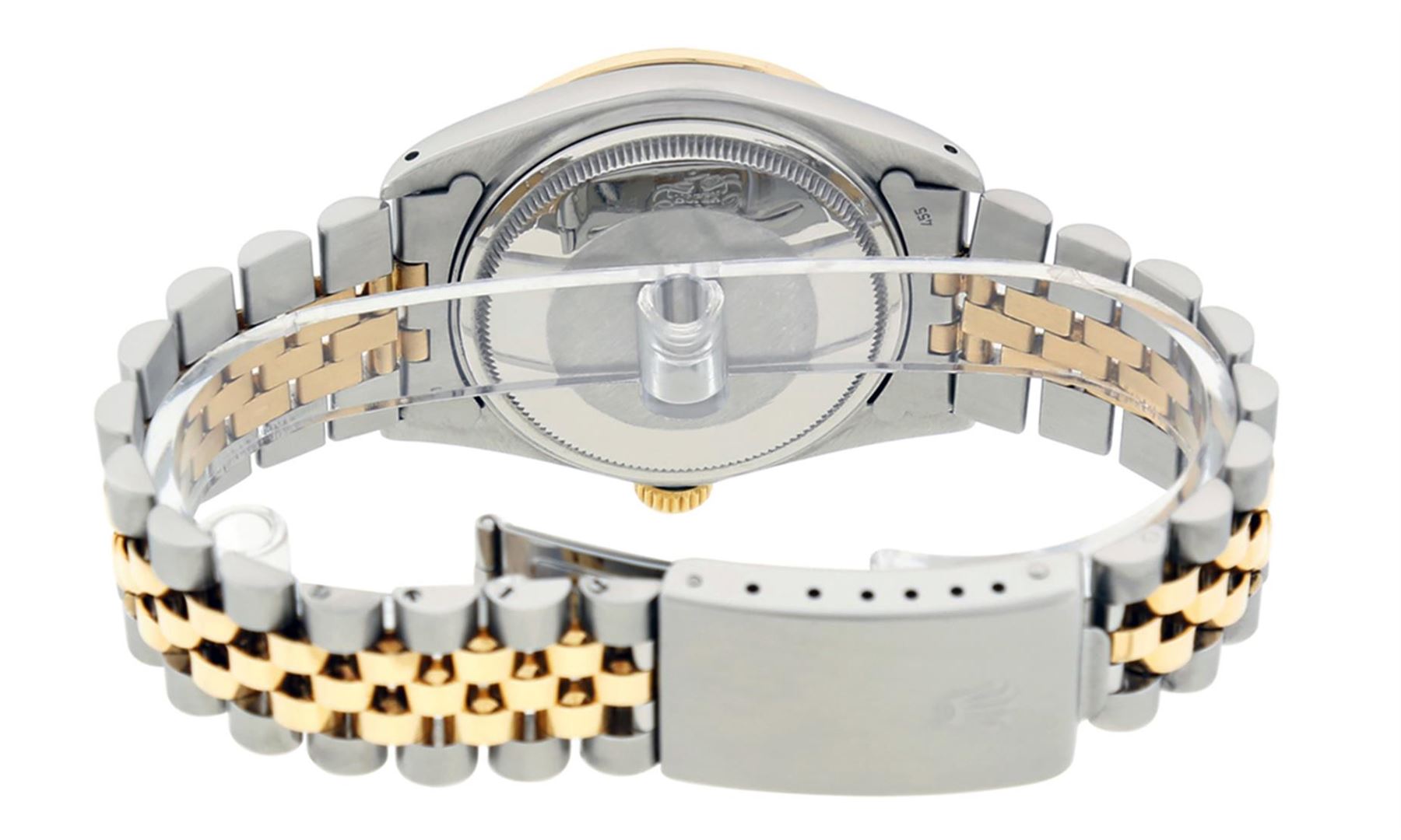 One Men's 14K Yellow Gold Two Tone Rolex Datejust Polished, Serviced & Electronically Tested, 18K Yellow Gold & Stainless Steel Case: 36mm, 18K Yellow Gold Crown, Custom Bezel: New 18K Yellow Gold Beadset Diamond Bezel, Diamond Count: 44 Diamonds, Total Weight 1.00 Carat, Clarity: SI-VS, Color: G to H. Crystal: New Synthetic Sapphire Cyclops Lens. Custom Hands: New Luminescent Hands. Movement: Automatic Winding Movement Caliber 3035. Custom Dial: Champagne and Baguette Diamond Hour Markers On 6 and 9, Diamond Count: 8 + 2 Baguette Diamonds in Dial G To H In Color, Clarity: VS2-SI1, Date Window: 3 O'Clock Position Date Display, Quickset, Model: 16013 Condition: G-6 Extra Fine. Bracelet: Two Tone 14K Yellow Gold & Stainless Steel Jubilee. Bright Polish. 7.0 Inch Length, Adjustable. Standard Clasp, With Rolex Logo. This Watch Has Been Serviced Time Tested And Is In Excellent Condition It Is Free Of All Scratches And Dents.