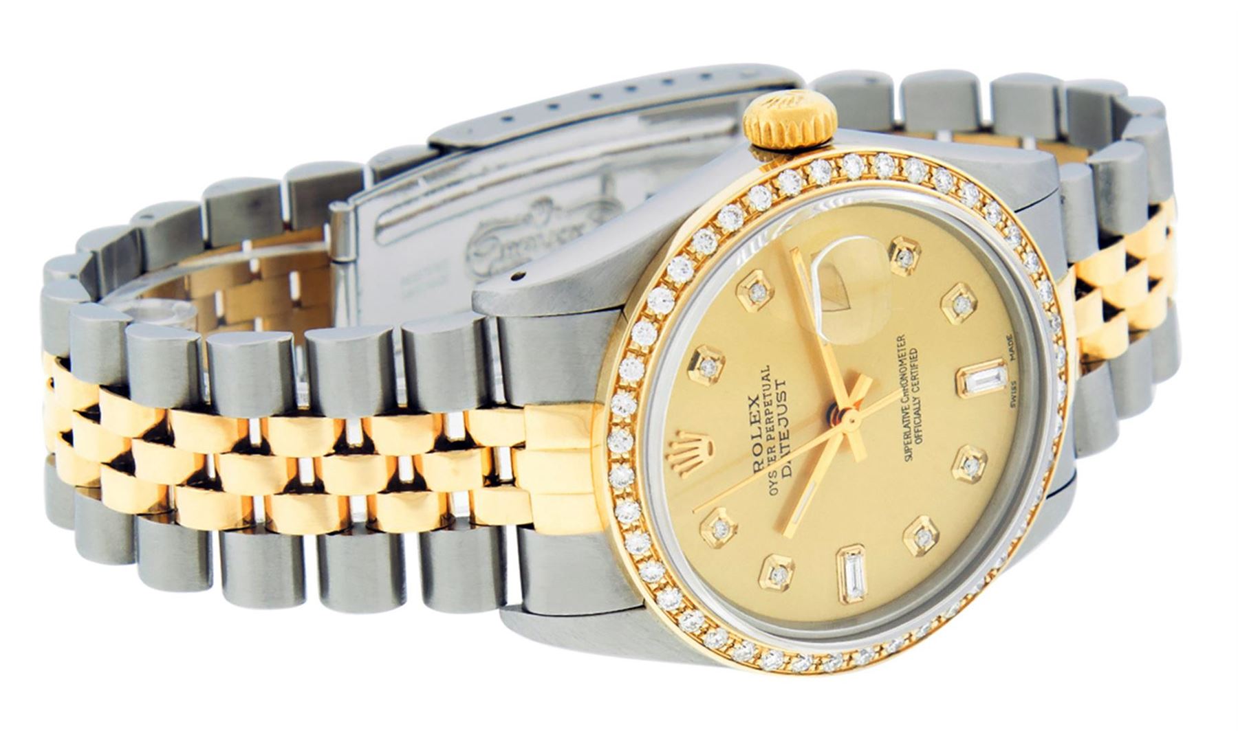 One Men's 14K Yellow Gold Two Tone Rolex Datejust Polished, Serviced & Electronically Tested, 18K Yellow Gold & Stainless Steel Case: 36mm, 18K Yellow Gold Crown, Custom Bezel: New 18K Yellow Gold Beadset Diamond Bezel, Diamond Count: 44 Diamonds, Total Weight 1.00 Carat, Clarity: SI-VS, Color: G to H. Crystal: New Synthetic Sapphire Cyclops Lens. Custom Hands: New Luminescent Hands. Movement: Automatic Winding Movement Caliber 3035. Custom Dial: Champagne and Baguette Diamond Hour Markers On 6 and 9, Diamond Count: 8 + 2 Baguette Diamonds in Dial G To H In Color, Clarity: VS2-SI1, Date Window: 3 O'Clock Position Date Display, Quickset, Model: 16013 Condition: G-6 Extra Fine. Bracelet: Two Tone 14K Yellow Gold & Stainless Steel Jubilee. Bright Polish. 7.0 Inch Length, Adjustable. Standard Clasp, With Rolex Logo. This Watch Has Been Serviced Time Tested And Is In Excellent Condition It Is Free Of All Scratches And Dents.