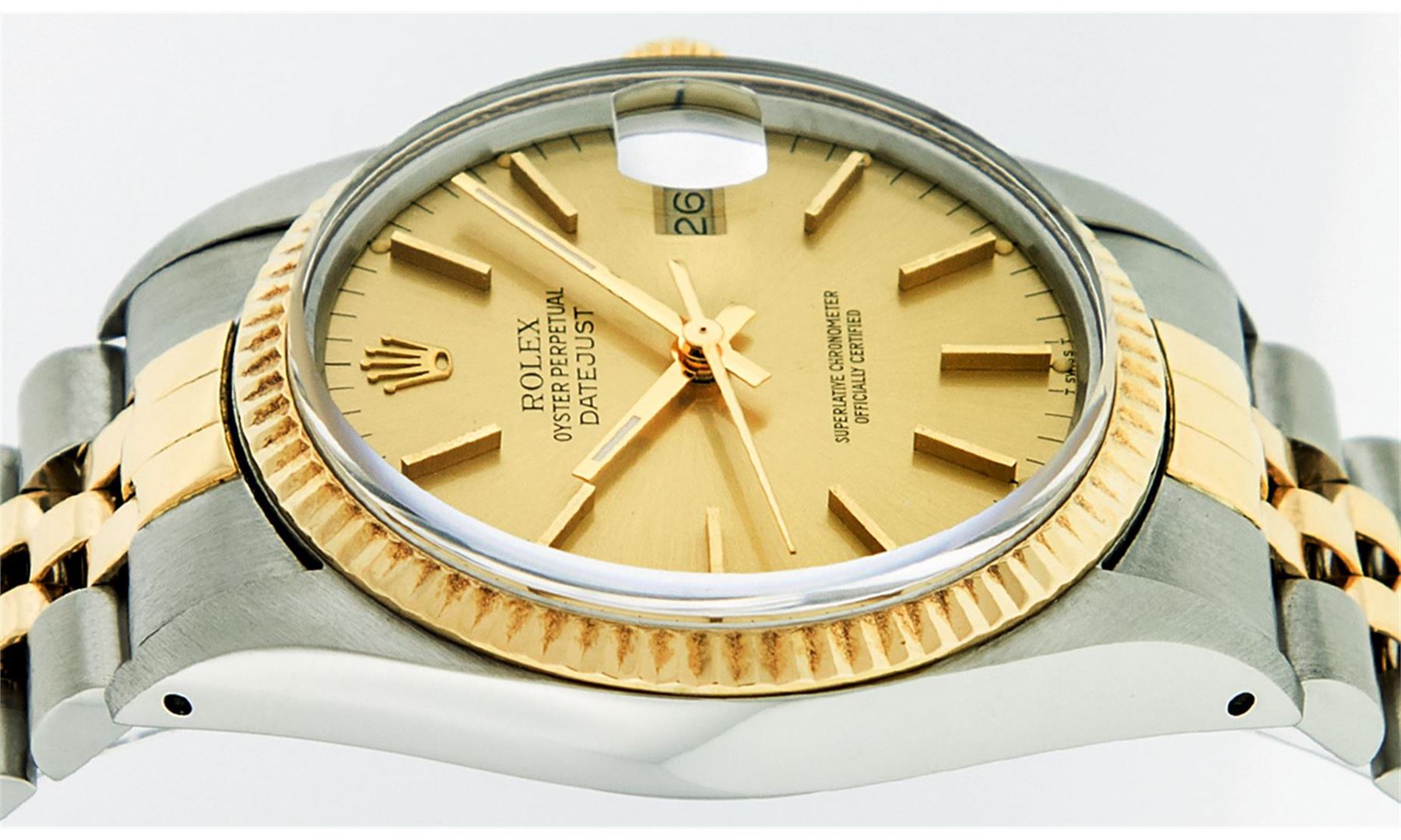 One Men's 14K Yellow Gold Two Tone Rolex Datejust Polished, Serviced & Electronically Tested, 14K Yellow Gold & Stainless Steel Case: 36mm,14K Yellow Gold Crown, Bezel: 14K Yellow Gold Fluted Bezel. Custom Crystal: New Acrylic Cyclops Lens. Custom Hands: New Luminescent Hands. Movement: Automatic Winding Movement Caliber 3035. Dial: Champagne Dial With Index Hour Markers and Small Track. Date Window: 3 O'Clock Position Date Display, Quickset, Model: 16013 Condition: G-6 Extra Fine. Bracelet: Two Tone 14K Yellow Gold & Stainless Steel Jubilee. Bright Polish. 7.0 Inch Length, Adjustable. Standard Clasp, With Rolex Logo. This Watch Has Been Serviced Time Tested And Is In Excellent Condition It Is Free Of All Scratches And Dents.