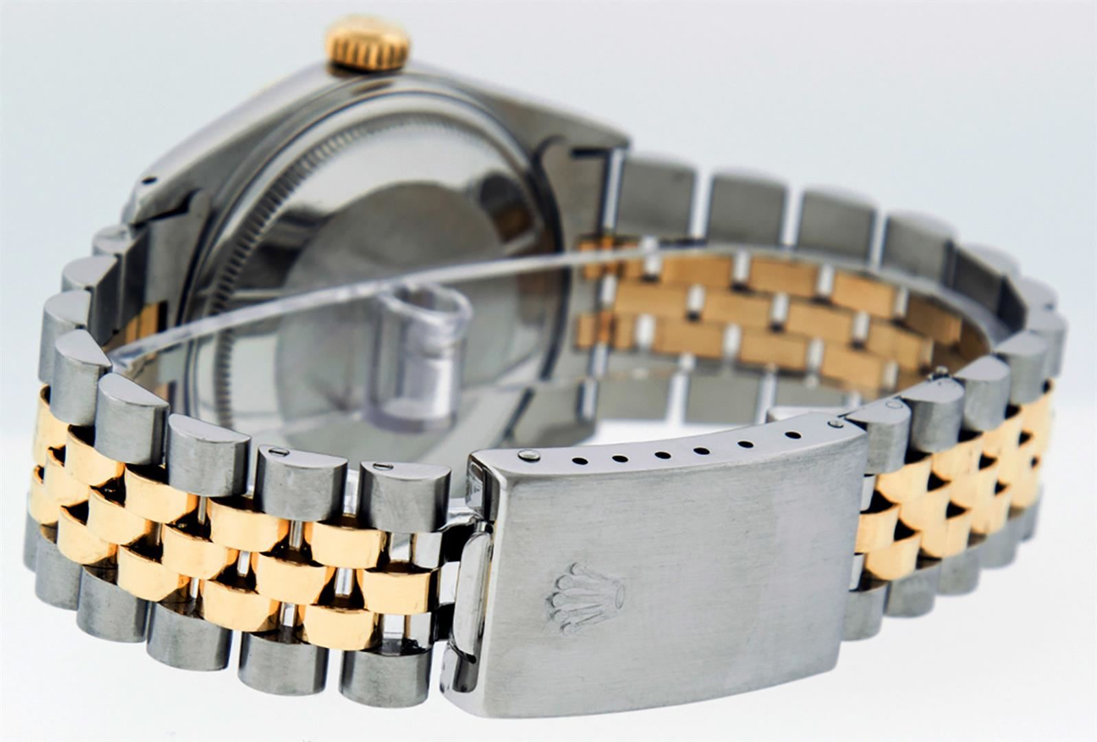 One Men's 14K Yellow Gold Two Tone Rolex Datejust Polished, Serviced & Electronically Tested, 14K Yellow Gold & Stainless Steel Case: 36mm, 14K Yellow Gold Crown, Bezel: 14K Yellow Gold Fluted Bezel. Custom Crystal: New Acrylic Cyclops Lens. Custom Hands: New Luminescent Hands. Movement: Automatic Winding Movement Caliber 3035. Custom Dial: Green Vignette Set With Diamond Hour Markers And Square Roman Track, Diamond Count: 10 Diamonds in Dial G To H In Color, SI-VS Clarity. Date Window: 3 O'clock Position Date Display, Quickset, Model: 16013 Datejust, Condition: G-6 Extra Fine. Bracelet: Two Tone 14K Yellow Gold & Stainless Steel Jubilee. Bright Polish. 7.0 Inch Length, Adjustable. Standard Clasp, With Rolex Logo. This Watch Has Been Serviced And Polished It Is Free Of All Scratches And Dents.