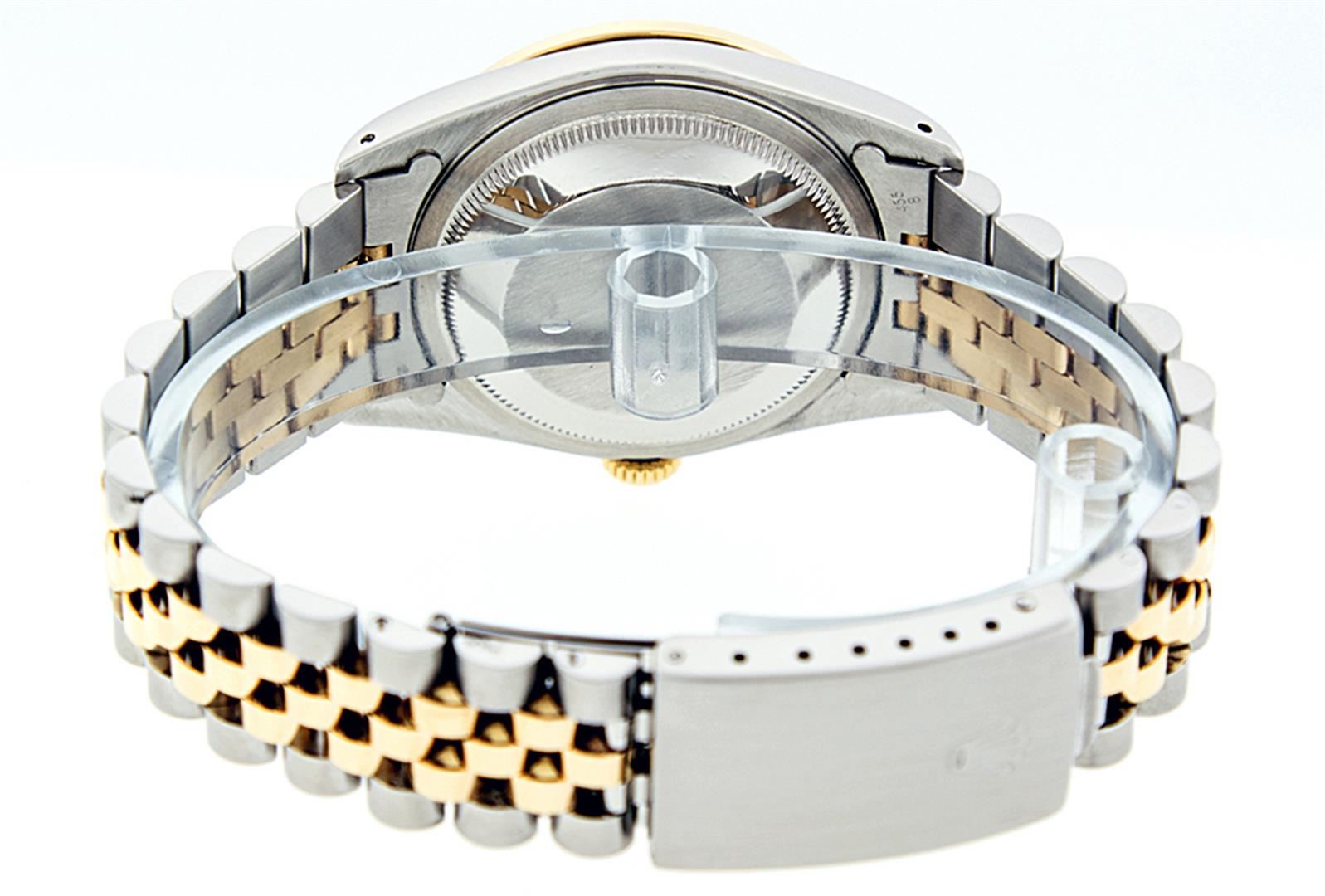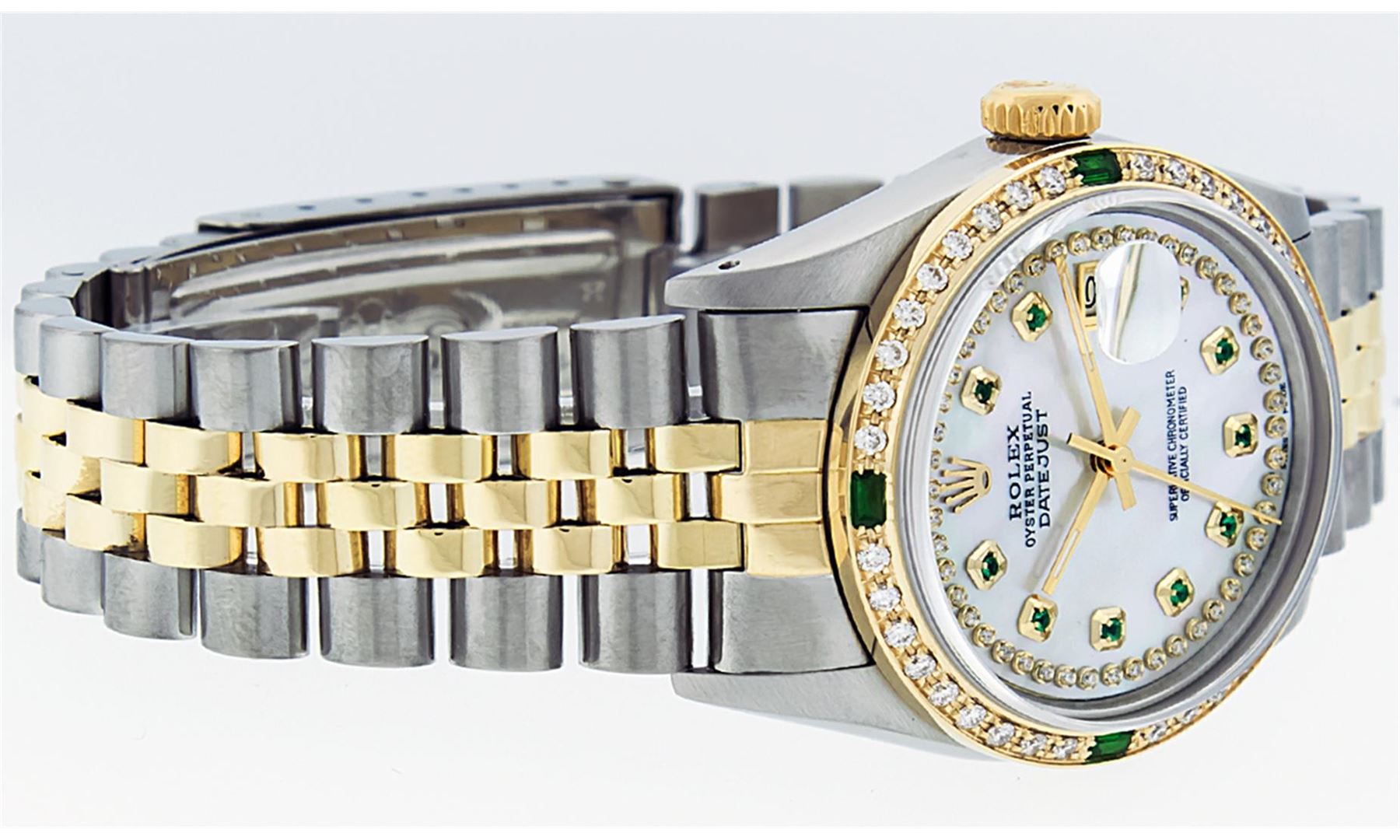 One Mens 14K Yellow Gold Two Tone Rolex Datejust Polished, Serviced & Electronically Tested, 14K Yellow Gold & Stainless Steel Case: 36mm, 14K Yellow Gold Crown, Custom Bezel: 18K Yellow Gold Synthetic Emerald Beadset Diamond Bezel, Diamond Count: 36 Diamonds + 4 Synthetic Emeralds, Total Weight 1.0 Carat, Clarity: SI-VS, Color: G to H. Custom Crystal: New Synthetic Sapphire Cyclops Lens. Custom Hands: New Luminecent Hands. Movement: Automatic Winding Movement Caliber 3035. Custom Dial: Mother Of Pearl String Diamond Dial, Diamond Count: 48 Diamonds + 10 Emeralds, Color: G to H, Clairty: SI-VS Date Window: 3 O'Clock Position Date Display, Quickset, Model: 16013 Condition: G-6 Extra Fine. Bracelet: Two Tone 14K Yellow Gold & Stainless Steel Jubilee. Bright Polish. 7.0 Inch Length, Adjustable. Standard Clasp, With Rolex Logo. This Watch Has Been Serviced Time Tested And Is In Excellent Condition It Is Free Of All Scratches And Dents.