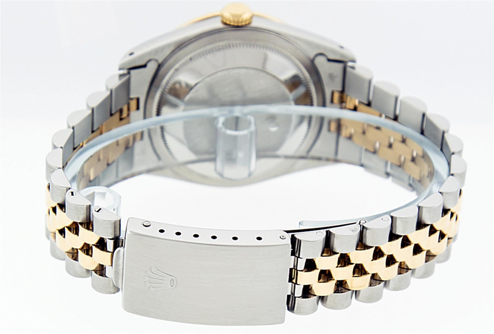 One Mens 14K Yellow Gold Two Tone Rolex Datejust Polished, Serviced & Electronically Tested, 14K Yellow Gold & Stainless Steel Case: 36mm, 14K Yellow Gold Crown, Custom Bezel: 18K Yellow Gold Synthetic Emerald Beadset Diamond Bezel, Diamond Count: 36 Diamonds + 4 Synthetic Emeralds, Total Weight 1.0 Carat, Clarity: SI-VS, Color: G to H. Custom Crystal: New Synthetic Sapphire Cyclops Lens. Custom Hands: New Luminecent Hands. Movement: Automatic Winding Movement Caliber 3035. Custom Dial: Mother Of Pearl String Diamond  Dial, Diamond Count: 48 Diamonds + 10 Emeralds, Color: G to H, Clairty: SI-VS Date Window: 3 O'Clock Position Date Display,  Quickset, Model: 16013 Condition: G-6 Extra Fine. Bracelet: Two Tone 14K Yellow Gold & Stainless Steel Jubilee. Bright Polish. 7.0 Inch Length, Adjustable. Standard Clasp, With Rolex Logo. This Watch Has Been Serviced Time Tested And Is In Excellent Condition It Is Free Of All Scratches And Dents.