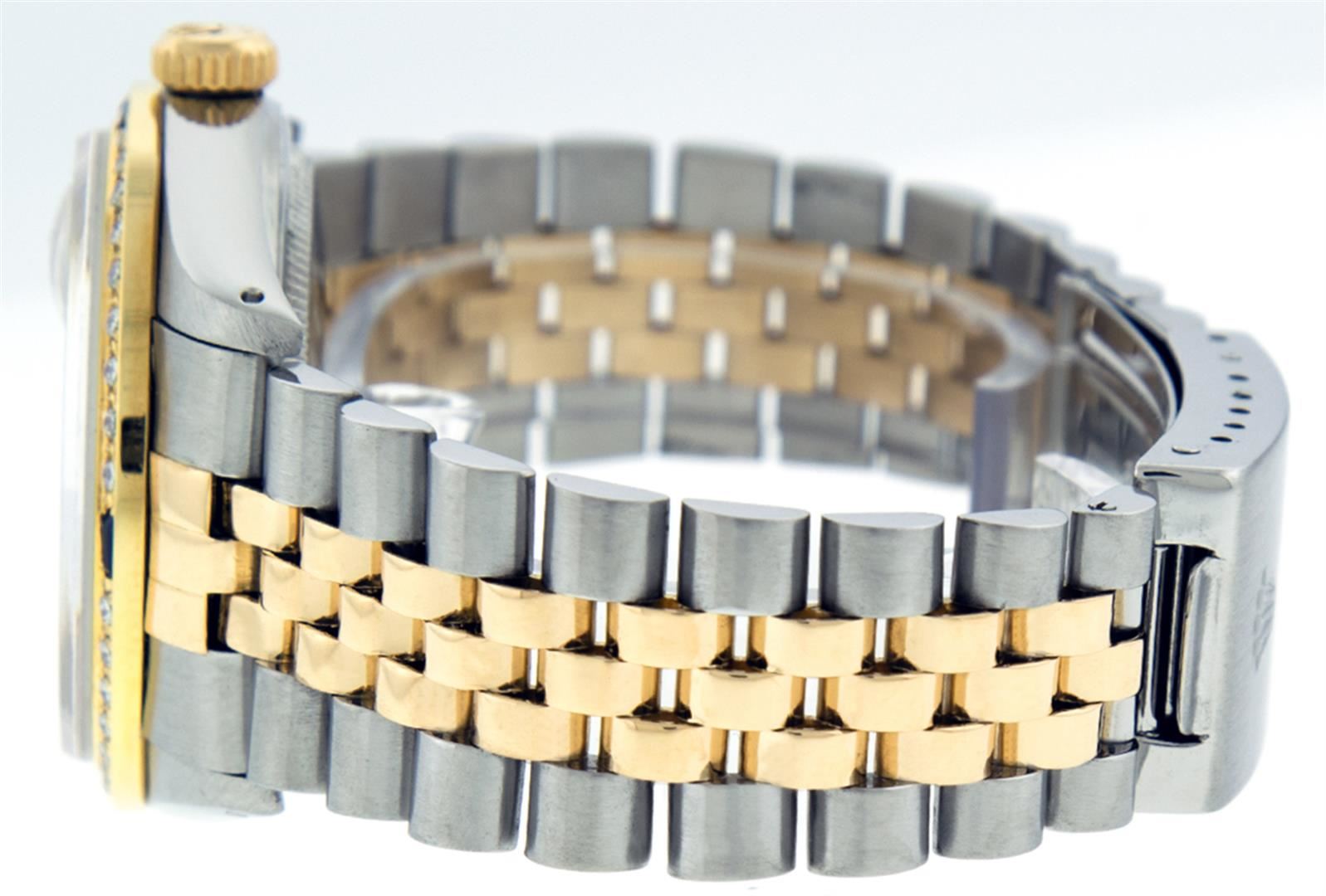 One Mens 14K Yellow Gold Two Tone Rolex Datejust Polished, Serviced & Electronically Tested, 14K Yellow Gold & Stainless Steel Case: 36mm, 14K Yellow Gold Crown, Custom Bezel: 18K Yellow Gold Sapphire Channel Set Diamond Bezel, Diamond Count: 52 Diamonds + 4 Sapphires, Total Weight 1.30 Carat, Clarity: SI-VS, Color: G to H. Custom Crystal: New Synthetic Sapphire Cyclops Lens. Custom Hands: New Hands. Movement: Automatic Winding Movement Caliber 3035. Custom Dial: Mother Of Pearl Dial With Sapphire Hour Markers, Stone Count: 10 Sapphires in Dial. Date Window: 3 O'Clock Position Date Display, Quickset, Model: 16013 Condition: G-6 Extra Fine. Bracelet: Two Tone 14K Yellow Gold & Stainless Steel Jubilee. Bright Polish. 7.0 Inch Length, Adjustable. Standard Clasp, With Rolex Logo. This Watch Has Been Serviced Time Tested And Is In Excellent Condition It Is Free Of All Scratches And Dents.