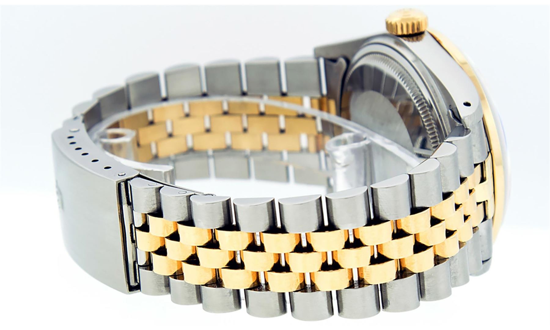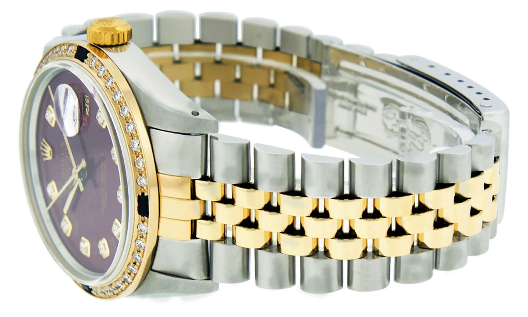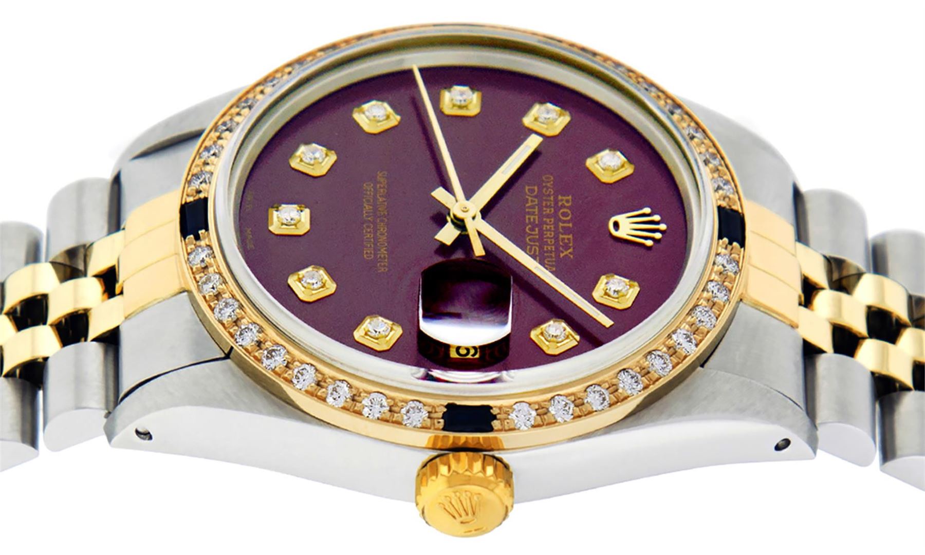 One Men's 14K Yellow Gold Two Tone Rolex Datejust Polished, Serviced & Electronically Tested, 14K Yellow Gold & Stainless Steel Case: 36mm, 14K Yellow Gold Crown, Custom Bezel: New 18K Yellow Gold Sapphire Beadset Diamond Bezel, Stone Count: 36 Diamonds + 4 Sapphires, Total Weight 1.00 Carat, Clarity: SI-VS, Color: G to H. Custom Crystal: New Synthetic Sapphire Cyclops Lens. Custom Hands: New Luminescent Hands. Movement: Automatic Winding Movement Caliber 3035. Custom Dial: Maroon Diamond Dial, Diamond Count: 10 Diamonds, Clarity: VS, Color: G to H. Date Window: 3 O'clock Position Date Display, Quickset, Model: 16013 Datejust. Condition: G-6 Extra Fine. Bracelet: Two Tone 14K Yellow Gold & Stainless Steel Jubilee. Bright Polish. 7.0 Inch Length, Adjustable. Standard Clasp, With Rolex Logo. This Watch Has Been Serviced Time Tested And Is In Excellent Condition It Is Free Of All Scratches And Dents.