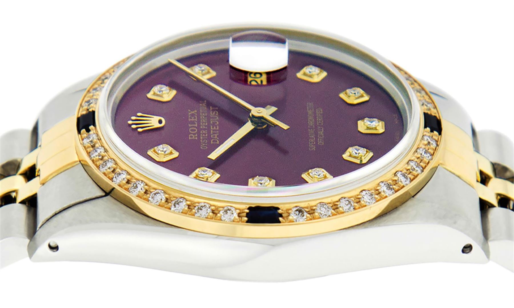 One Men's 14K Yellow Gold Two Tone Rolex Datejust Polished, Serviced & Electronically Tested, 14K Yellow Gold & Stainless Steel Case: 36mm, 14K Yellow Gold Crown, Custom Bezel: New 18K Yellow Gold Sapphire Beadset Diamond Bezel, Stone Count: 36 Diamonds + 4 Sapphires, Total Weight 1.00 Carat, Clarity: SI-VS, Color: G to H. Custom Crystal: New Synthetic Sapphire Cyclops Lens. Custom Hands: New Luminescent Hands. Movement: Automatic Winding Movement Caliber 3035. Custom Dial: Maroon Diamond Dial, Diamond Count: 10 Diamonds, Clarity: VS, Color: G to H. Date Window: 3 O'clock Position Date Display, Quickset, Model: 16013 Datejust. Condition: G-6 Extra Fine. Bracelet: Two Tone 14K Yellow Gold & Stainless Steel Jubilee. Bright Polish. 7.0 Inch Length, Adjustable. Standard Clasp, With Rolex Logo. This Watch Has Been Serviced Time Tested And Is In Excellent Condition It Is Free Of All Scratches And Dents.
