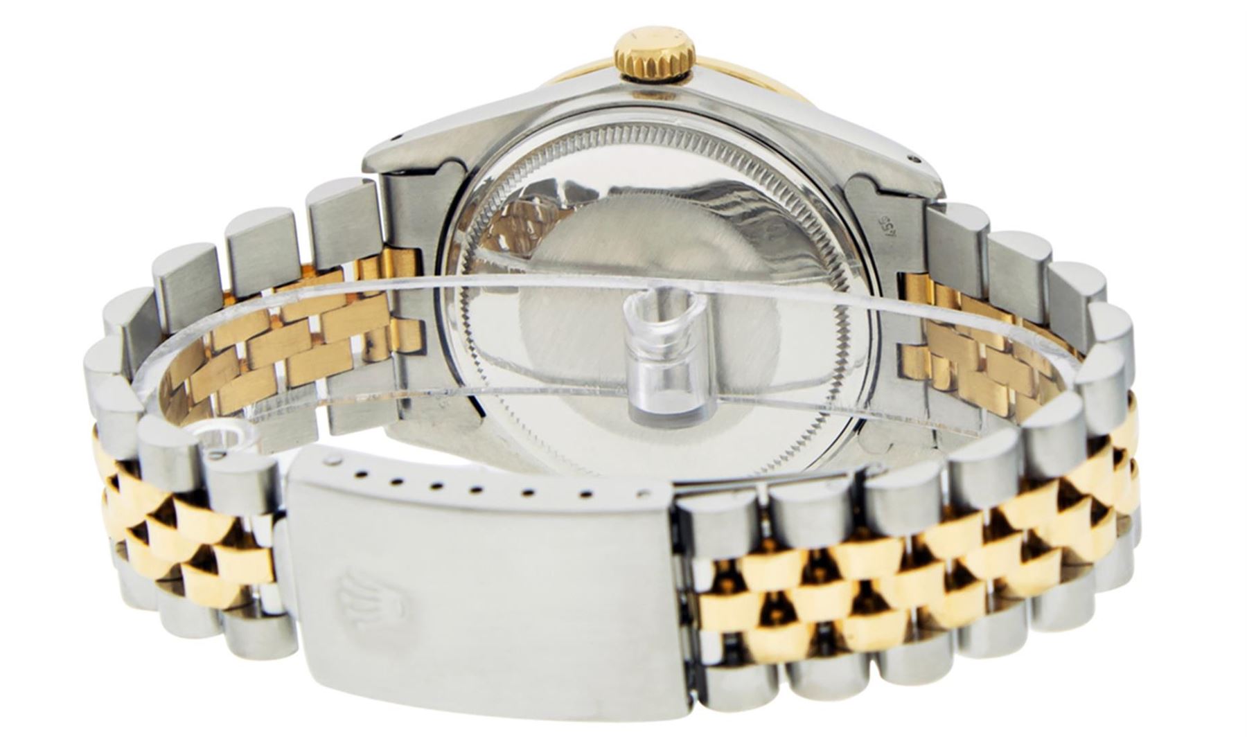 One Mens 14K Yellow Gold Two Tone Rolex Datejust Polished, Serviced & Electronically Tested, 14K Yellow Gold & Stainless Steel Case: 36mm, 14K Yellow Gold Crown, Custom Bezel: 18K Yellow Gold Beadset Diamond Bezel, Diamond Count: 44 Diamonds, Total Weight 1.00 Carat, Clarity: SI-VS, Color: G to H. Custom Crystal: New Synthetic Sapphire Cyclops Lens. Custom Hands: New Luminecent Hands. Movement: Automatic Winding Movement Caliber 3035. Custom Dial: Mother Of Pearl Roman Dial. Date Window: 3 O'Clock Position Date Display, Quickset, Model: 16013 Condition: G-6 Extra Fine. Bracelet: Two Tone 14K Yellow Gold & Stainless Steel Jubilee. Bright Polish. 7.0 Inch Length, Adjustable. Standard Clasp, With Rolex Logo. This Watch Has Been Serviced Time Tested And Is In Excellent Condition It Is Free Of All Scratches And Dents.
